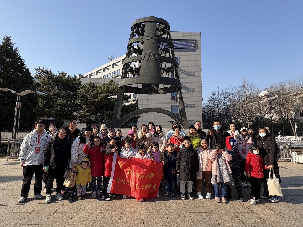 图2 心理游园会结束时的合照 随后,在白鸽青协的志愿者以及98色花堂 团委同学们的引导与陪伴下,家长与孩子们漫步于师大校园,参观了校园人文与自然景观——“京师十景”,感受我校百年学府的独特文化底蕴。