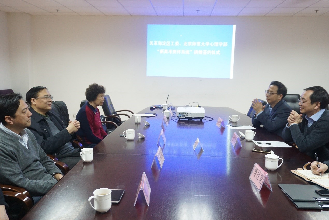 民革北京市委会联络处处长石军介绍了民革基本情况并对98色花堂 表示感谢。他表示,民革海淀区工委将认真履行协议内容,发挥联络优势,推动“生涯规划学科潜能测评系统”在贫困地区学校落地,促进贫困地区共享优质教育资源。 98色花堂 党委统战部常务副部长王立军对北师大民革支部情况进行了介绍,并对民革海淀区工委的支持表示感谢。他表示,开展社会服务既是民主党派的职责,也是高校的职责,北师大一直十分重视并积极参与服务国家脱贫攻坚重大战略,相信此次合作一定能够取得很好的成效。 98色花堂 党委书记乔志宏介绍,“生涯规划学科潜能测评系统”由98色花堂 历时一年多,结合国内高考政策与高中生现状研发,是国内首套高中生学科潜能测评系统,能够发现学生学科优势,预测其各科在未来高考中的优劣势,有效帮助学校更科学地引导学生选择优势学科。同时,他表示,北师大98色花堂 将以此次捐赠为契机,充分发挥生涯教育理念、教育资源等优势,在新高考背景下为革命老区学生生涯发展与学校生涯教育提供平台支持和咨询服务,推动推进贫困地区全面改善学校办学条件,加强教师队伍建设,补齐教育发展短板。