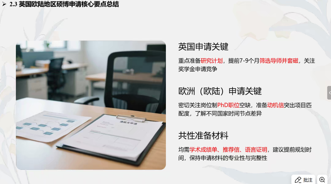 在欧陆地区申请方面,孙艺同学介绍了欧陆岗位制博士的独特模式,申请者需着重准备动机信并突出与项目的匹配度。