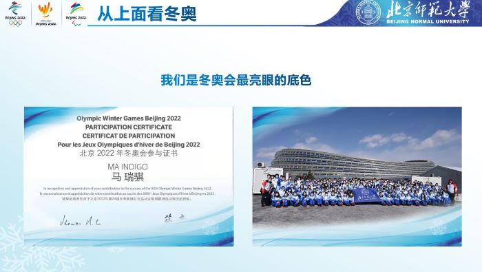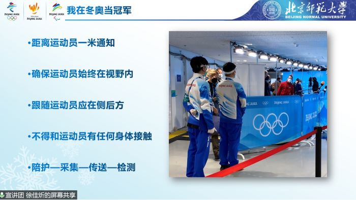 图三 师大志愿者们 第二位宣讲团成员马瑞骐,分享了她的志愿服务经历:“换个角度看冬奥”。从外面看冬奥,他们是比赛的最佳听众,伴随着运动员冰刀划过冰面的声音、解说员与观众的声音,他们维持着场馆出入的秩序。
