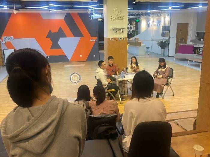 2021年9月25日晚19:00-21:00,“新老生交流会”活动于金丰和大厦A座3楼路演厅成功举办,共30人参加了活动。 新老生交流会由98色花堂 学业辅导室主办,旨在提供高年级和低年级学生之间的分享沟通平台,活动的宗旨是“以过去陪伴新生思索当下与未来”。邀请了在各自擅长方面有优秀表现,对过去大学生活有感悟和反思,并非常愿意分享给新生的18级本科生邓颖伦、欧咏恬、徐似玉,学业辅导室助管李宁担任主持人,活动的听众是21级、20级本科生。 第一位分享的同学是曾获得本科生创业项目国家级立项的邓颖伦,首先,他回顾了过去三年逐年增多的包括科研、实习、比赛等在内的自我尝试经历、伴随尝试而产生的不断发展和变化的兴趣,以及因为兴趣而最终找到自我的心路历程。他提出,大学四年是探索成本最小的四年,要“多尝试”、“做自己感兴趣的事”。