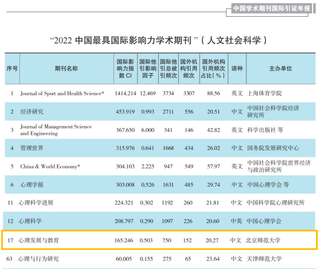 | 【喜报】《心理发展与教育》入选“2022中国最具国际影响力学术期刊” |