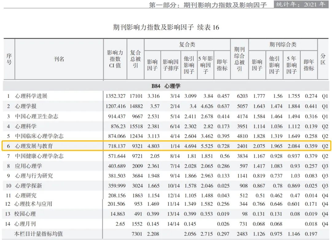 近日,由中国知网·中国科学文献计量评价研究中心和清华大学图书馆联合研制完成的《中国学术期刊国际引证年报》(2022版)已正式对外发布。 《年报》(2022版)汇总了我国学术期刊国际他引总被引频次(TC)、国际他引影响因子(IF)和期刊影响力指数(CI)等度量期刊学术创新影响力和整体学术水平的重要指标。在满足“TC和IF排名均位于前20%”的条件下,最终按CI排序遴选了前TOP 5%的期刊为“中国最具国际影响力学术期刊”、TOP 5%-10%的期刊为“中国国际影响力优秀学术期刊”。 《心理发展与教育》以国际影响力指数165.246、国际他引总被引频次750、国际他引影响因子0.503,被评为“2022中国最具国际影响力学术期刊”。此外《心理发展与教育》期刊综合影响因子为2.075,复合影响因子为4.803,在心理学影响因子学科排序中位列第一。