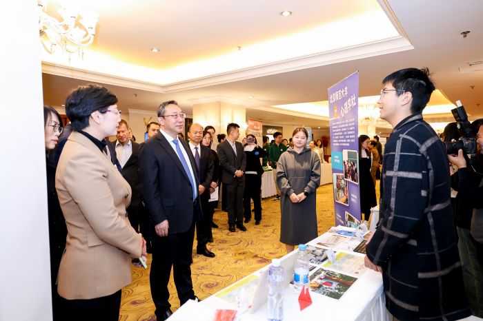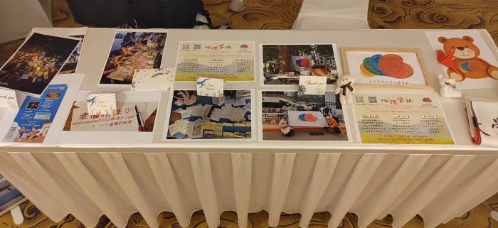 图注:交流活动现场照片 本次活动以为加强心理健康和精神卫生防治国际合作交流、促进我国心理健康和精神卫生服务发展为目标、汇聚政府部门、院校机构和国际组织的嘉宾、代表行业学协会、医疗卫生机构等的专家学者交流经验、分享成果、坚定信心、明确使命。 在高校心理社团展区,我校心理社团的成员们精心安排了展位,向参加活动的专家领导、国际组织官员、医疗机构代表与其他高校志同道合的同学们介绍了心理学社在学校开展的心语心话、解忧信箱等朋辈互助活动,获得了专家们的一致赞赏。