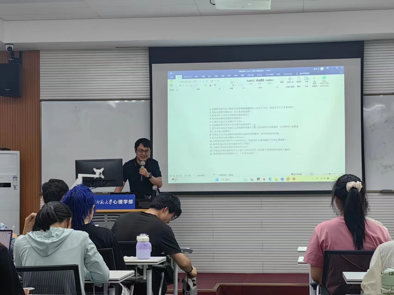 然后,王乾东老师详细的介绍了心理学不同领域的相关内容,指导同学们的科研方向,并以自己的研究内容作为例子。