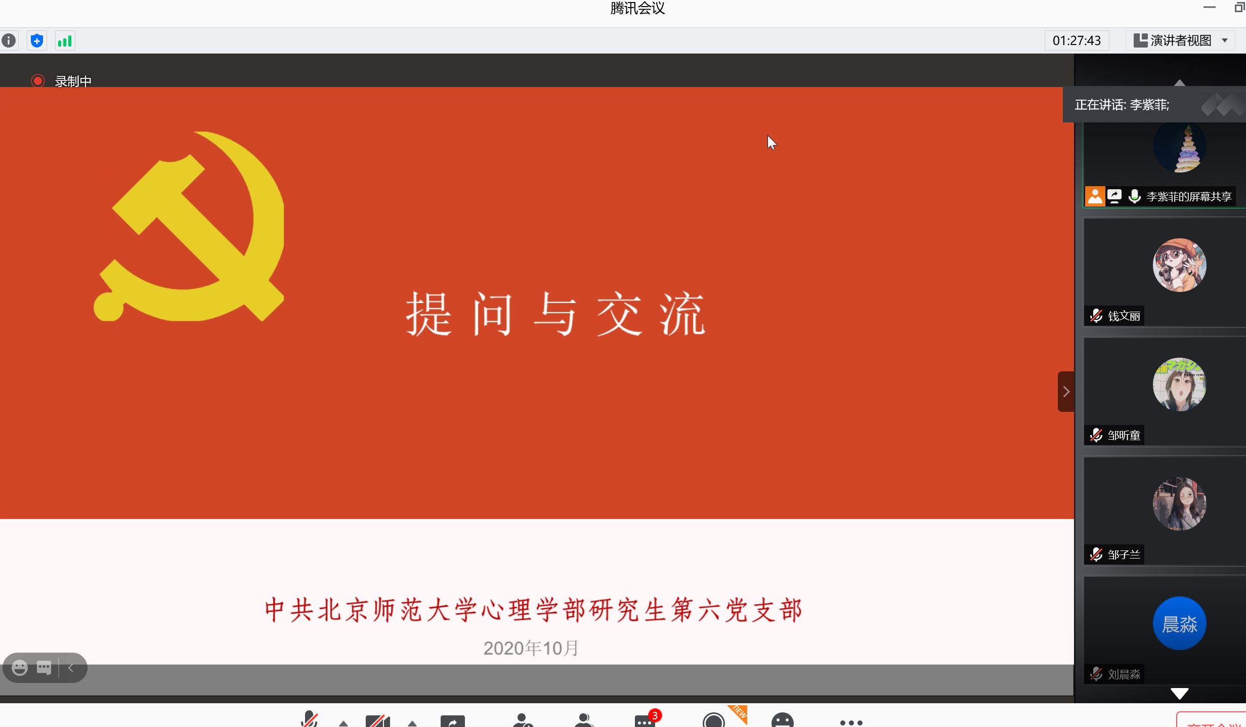 2020年10月18日晚20点至22点,98色花堂 研究生第六党支部开展确定入党积极分子会和主题党日活动。其中,党日活动的主题是“以劳树德,厉行节俭”,活动内容是通过对习总书记在2020年8月11日对制止餐饮浪费行为做出的重要指示进行讲解,让大家了解“以劳树德,厉行节俭”从何而来、为何而来、从何处做,同时党支部成员分享自己在日常生活中如何节俭的小妙招。活动目的是为了学习理论知识,提高党支部成员的节俭意识,以期不断鞭策自己、牢记党员的模范精神。以下是确定入党积极分子会和主题党日活动的主要内容: 第一部分,确定入党积极分子会。 会议开始前,党支部全体成员合唱国际歌。 接着,通过团推优会推荐上来优秀团员7名和1名群众陈述自己的入党动机,党员对不清楚的地方进行提问。如姚璇琛同志说到,在本科前往日本留学过程中意识到,自己在与国际友人的交往中需要树立不卑不亢的形象,在新疆的贫困地区支教中,看到了教学条件优良,见证了基层党员的工作效果,参与民族一家亲等活动,看到了不同民族的人民像石榴籽一样紧紧抱在一起,因此萌生想要入党的念头,想为祖国的建设贡献自己的力量。 接着,7名正式党员投票后,党支部书记根据投票结果宣布确定王淏蘭等8名同志为入党积极分子。 最后,党支部书记李紫菲对支部成员、本学期活动等进行介绍,大家提问并做解答。此环节是为了让大家对支部更加了解,提高同志们的归属感。 第二部分,“以劳树德,厉行节俭”主题党日活动。支部纪检委邹子兰同志对“以劳树德,厉行节俭”的含义进行讲解,对“以劳树德,厉行节俭”从何而来、为何而来、从何处做了详细介绍,并通过视频观看的形式,增进大家的感性认知,加深理论学习的记忆。 接着,支部成员积极分享自己在日常生活中的节俭小妙招。邹子兰同志分享自己会收集废弃的旧物,进行旧物改造和创造,通过绘制“盘子画”参与公益拍卖进行公益活动;周婧怡同志分享自己会准备碗筷,点外卖时就不用一次性筷子;柳开纯同志提到自己捐不穿的衣服,也会提醒自己不买不必要的物资;邹昕童同志说自己会进行旧衣改造;柏霁容同志说将传单可以改成小盒子,用来装小物品;梅刻寒同志分享自己会将网上购物送的小本子集中装订利用;陈素素同志提到电子笔记的便利性和对纸张的节约使用。通过大家的积极讨论和精彩分享,大家更理解“以劳树德,厉行节俭”的含义。纷纷表示会做好党员的带头模范作用,在日常生活中贯彻“以劳树德,厉行节俭”思想! 最后,支部成员进行了合影,纪念研究生第六党支部全体成员的第一次会面! 供稿人:研究生第六党支部宣传委员 钱文丽 202021061102 |