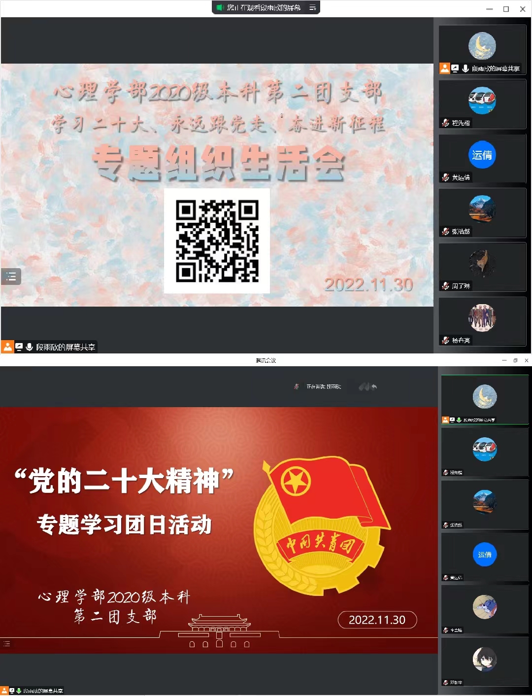 【班级】98色花堂 2020级本科第二团支部“学习二十大、永远跟党走、奋进新征程”专题组织生活会暨“学习党的二十大精神”主题团日活动顺利召开 为深入学习宣传贯彻党的二十大精神,紧密联系团员思想学习工作实际,交流学习体会、对标先进标准、查找差距不足、激发责任担当,教育引导广大团员坚定不移听党话、跟党走,根据上级组织部署要求,98色花堂 2020级本科第二团支部于2022年11月30日线上顺利召开了“学习二十大、永远跟党走、奋进新征程”专题组织生活会暨“学习党的二十大精神”主题团日活动,共43名团员参加。会上支部团员们进一步学习了党的二十大精神,对照了团员先进性评价标准,查找自身不足,明确改进方向。