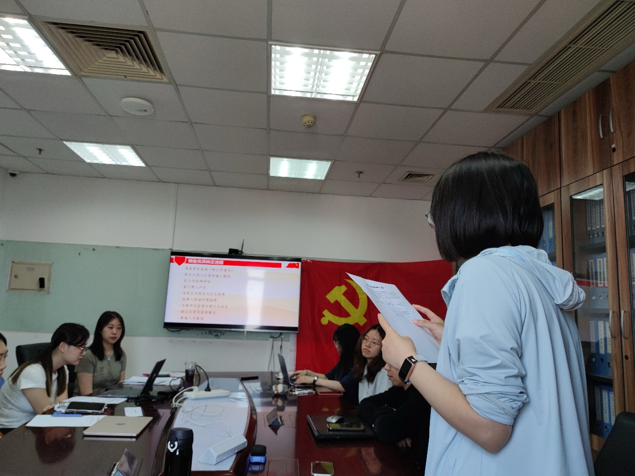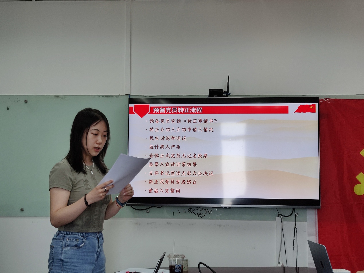 首先,石佳霖同志宣读转正申请书,向党组织汇报了自己预备期内在思想、学习、生活等方面情况,着重介绍了在理论学习、实践活动等方面的自我提升,表明成为正式党员的决心和未来努力的方向。