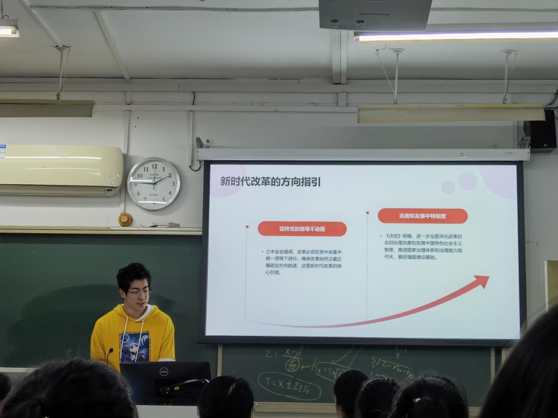 会议伊始,团支书龙柄屹首先介绍了党的二十届三中全会的基本情况,强调了全面深化改革对于实现国家治理体系和治理能力现代化的重大意义。接着,通过PPT展示,详细解读了全会公报中的重点内容,包括经济体制改革、系统立机立制、发展全过程人民民主实践、政治体制改革推进、文化体制改革创新以及社会治理体系完善等方面。