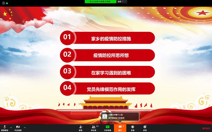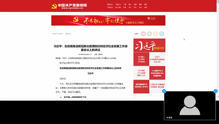 2020年3月28日20:30,研究生第十五党支部通过zoom在线会议平台召开了本学期第一次组织生活会,支书朱春鹭主持了本次会议。 图1会议开始 会前,征集同学们的建议,将此次会议的目标设定在疫情期间的所见所想和线上学习的困难与应对上。会议开始,支书先带领大家一起回顾了习近平总书记“在统筹推进新冠肺炎疫情防控和经济社会发展工作部署会议上的话”。总书记在讲话中说到“关键时刻冲得上去、危难关头豁得出来,才是真正的共产党人。”同学们根据讲话内容,联系自身的所见所闻,分享了各自家乡的疫情防控措施,互相了解不同地区的疫情防控情况。也有同学分享了自己在疫情期间所做的贡献,比如作为志愿者参与了疫情心理援助热线的相关工作。 图2回顾讲话 之后,对于在家学习的方式,大家描述自己遇到的困难,对于已经解决的部分,分享自己的经验。对于未解决的部分,大家群策群力,提出各种解决办法。比如,针对上课期间地眼睛保护,大家纷纷给出了自己的“小妙招”;对于如何养成在家锻炼身体的习惯,也提出了“监督打卡”等方案;对于接下来实习安排的焦虑,这是大家不可控的,所以互相鼓励给予支持。 图3线上会议合影 会议最后,同学们分享自己的学习规划以及在家所能做的“自我关怀”项目,更好地保证学习,保持良好心态。大家总结讨论到的各种解决方案,共同探讨党员应该如何发挥先锋模范作用,为班级贡献自己的力量。结合当前的疫情发展情况,大家一致认为疫情防控不可掉以轻心,仍然要保持高度警惕。同学们也一同表达了对校园的思念,希望能够尽快回到校园,与老师同学们相见。 供图供稿:朱春鹭 王静怡 研究生第十五党支部 |
