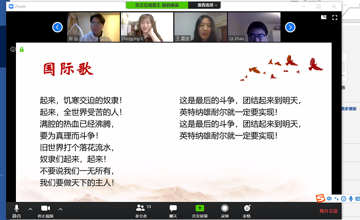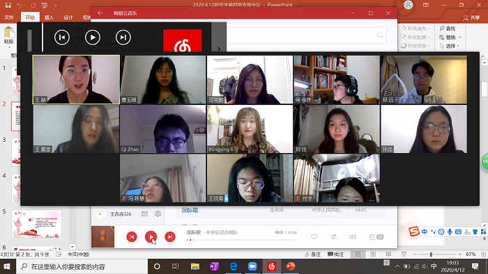 受疫情影响,4月12日晚7点,98色花堂 19级学硕第四党支部的党员们通过线上会议的形式,召开了本学期第二次支部会议大家积极参与。 正式会议开始前,全体党员线上合唱国际歌。 会议开始后,先由郑远同学带领大家学习了习近平总书记关于新冠肺炎疫情防控指示精神和中央重大决策部署中有关经济政策的部分,之后由王嘉莹同学分享了新冠肺炎疫情防控中习近平总书记“为打赢疫情防控阻击战提供强大科技支撑”的讲话,并对科技对疫情防控的效果进行了分享。 本次生活会的第三项内容是支部的同学们一起进行了学习强国专项答题活动,大家共同回答了“防疫有我,爱卫同行”专项答题、“学习贯彻国家主席习近平在二十国集团领导人应对新冠肺炎特别峰会上的讲话精神”专项答题和“疫情防控期间办公建筑安全、心理健康知识”专项答题。通过轮流答题,对答案进行题目进行分析解读,同学们都有很大收获。 相比于第一次线上组织生活会,这一次大家已经逐渐适应了线上会议的特点,并且在组织生活会上有所收获。 |
