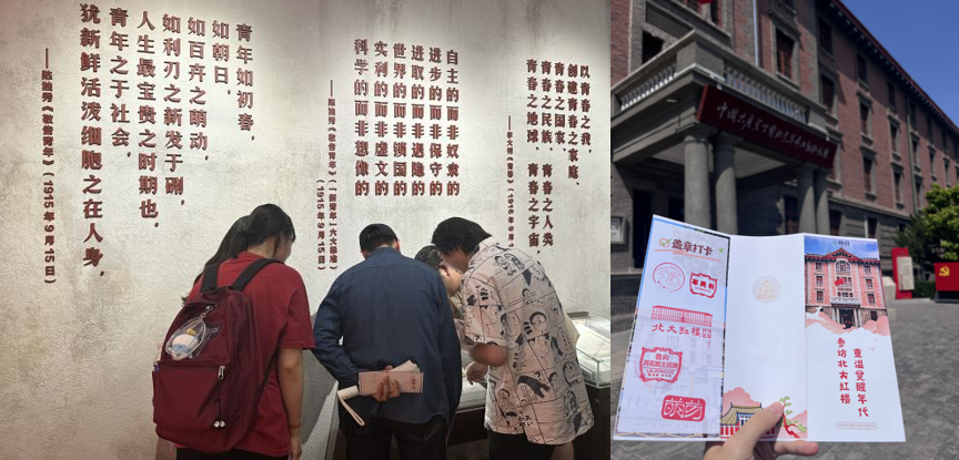 北大红楼主题展览内容非常丰富,展馆里分别展示了从清末辛亥革命到民国时期的五四运动再到当今社会的发展历程,同学们在此身临其境地感受了“经历近代各种力量救亡图存探索的失败,工人阶级开始登上历史舞台”“唤起民族觉醒,构筑新文化运动的中心”“高举爱国旗帜,形成五四运动的策源地”“播撒革命火种,打造马克思主义在中国早期传播的主阵地”“酝酿和筹建中国共产党,铸就党的主要孕育地之一”“不忘初心,牢记使命”等六大主题的展览,通过旧址复原、场景再现、真实照片、文字材料和数字影像等多种形式的呈现,同学一方面感受和体验到了先辈们在那个时期的学习和工作环境,更加深刻的理解了当今生活的来之不易,另一方面也加深了同学们对于马克思主义在中国的传播和发展历程的认识,感悟了百年前先辈们为了社会进步和建设新中国而奋斗的光辉伟业,让置身展览中同学们仿佛回到了那个波澜壮阔的觉醒年代,参观活动结束后,同学们还去革命活动纪念馆的文创店进行了集章打卡,为此次活动留下属于自己的独特印记。