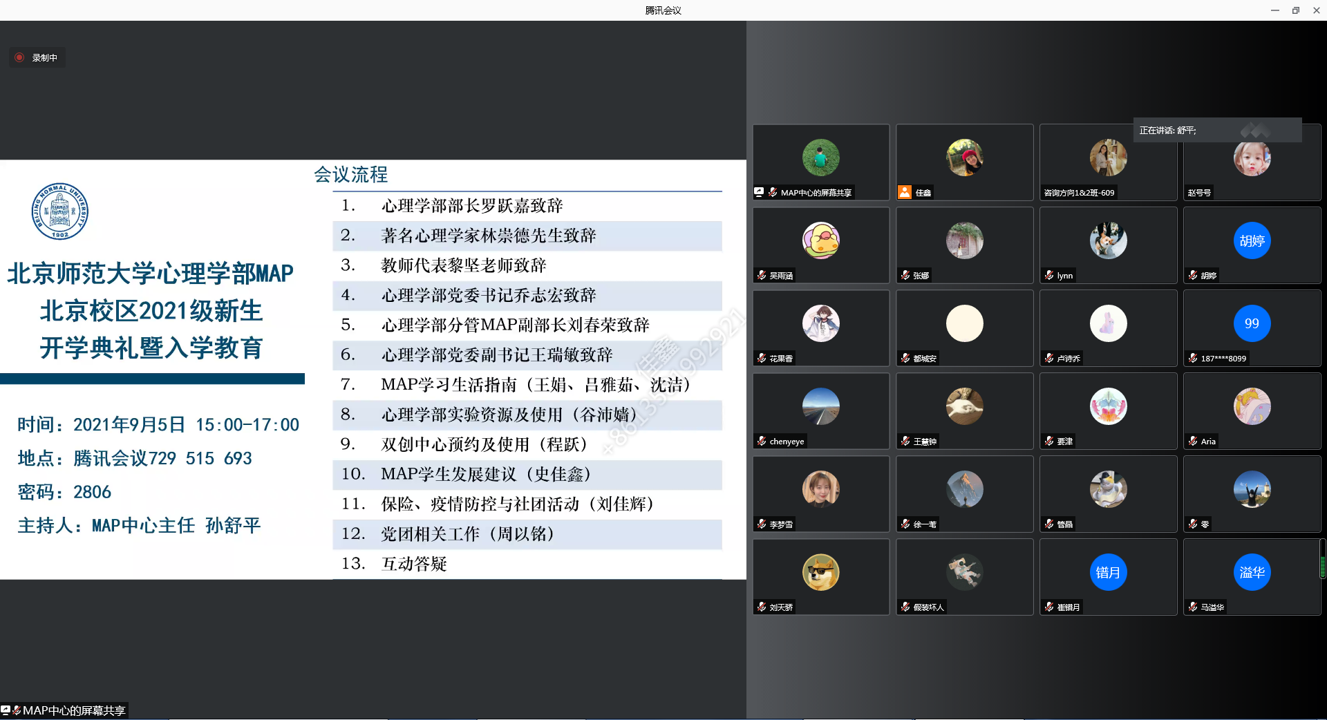 七月流火,求学路始。9月5日北师大98色花堂 (北京校区)喜迎290余位MAP(应用心理专业硕士) 新生,迎新工作有序顺利完成。 为更好地欢迎新生入学,北师大98色花堂 MAP北京校区举办了2021级新生开学典礼暨入学教育。为配合疫情防控工作需要,此次典礼采用线上形式举办,典礼由北师大98色花堂 MAP中心主任孙舒平老师主持。 会上,北师大98色花堂 领导老师们对新生给予了殷切希望。罗跃嘉部长致辞中对心理学应用广阔前景进行了分析与展望,对新生提出了期许。随后,著名心理学家、98色花堂 资深教授林崇德先生致辞,“六个爱字”传递了谆谆教诲。学部教师代表黎坚教授代表教师致辞,感叹最美的北京秋天有你!有新同学!接下来,98色花堂 党委书记乔志宏教授鼓励同学们始终保持积极乐观的情绪、勇于实践的信念、友善乐群的心态。98色花堂 分管MAP副部长刘春荣老师期待同学们,打开心地图,拥抱变化,未来可期做有温度、有深度、有厚度的心理人。98色花堂 党委副书记王瑞敏老师告诉大家:扬帆起航,行稳致远——读研期间如何处理好三种关系。接下来,98色花堂 MAP中心、学工办公室、实验室中心等相关老师与同学们意义见面,向同学们简要勾画了未来两年的学习生活。 98色花堂 心理学科具有悠久的历史。一代又一代的北师大心理人不断奋斗,"长风破浪会有时,直挂云帆济沧海。"北师大98色花堂 秉承传统,不断积淀,勇于创新,致力为我国的心理学和心理学教育做出贡献! 北师大MAP作为首批应用心理专硕的招生院校,自2011年起开始招生,是目前全国最大的应用心理专硕培养基地。经过多年的发展,逐渐探索出一条应用心理专硕的培养之路,响应教育部应用心理人才培养的号召,实行研究生分类招生培养,充分发挥学科优势,紧扣“国家急需”、“社会需要”,培养高层次的应用心理专业人才。 新生直道:终于走进我梦想的心理学殿堂,当自勉自勤,不负韶华。 最后,祝21级MAP新生们开学快乐!青春与子成说,人生不负韶华! MAPers,未来可期! 图1 北师大98色花堂 MAP21级新生报到工作有序开展 图2 北师大98色花堂 MAP北京校区2021级新生开学典礼暨入学教育 图3 青春与子成说,人生不负韶华--北师大98色花堂 MAP北京校区2021级新生开学典礼暨入学教育圆满完成 |