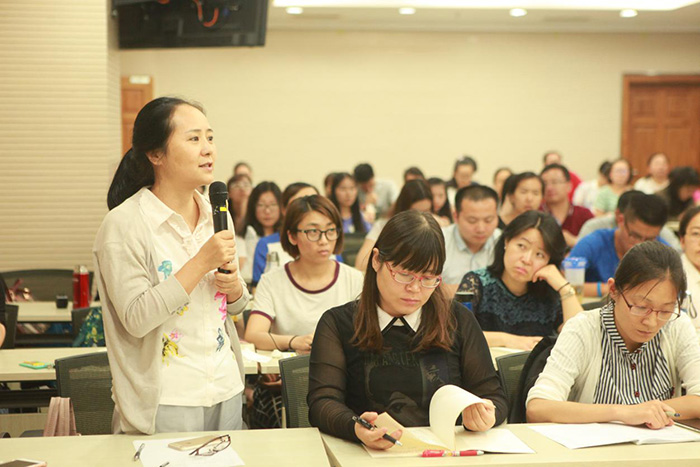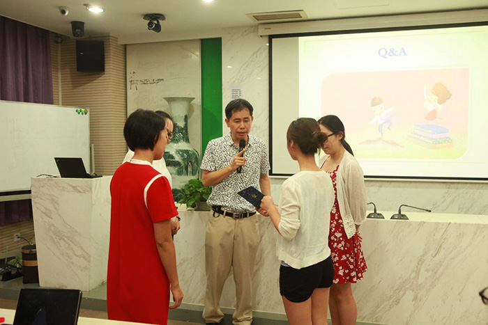连教授与同学们的互动环节,同学们争相举手,迫切希望解决自己在实际咨询中遇到的问题,比如,青少年团体辅导如何进行,咨访信任关系如何建立,青少年如何肯定自我价值,孩子如何爱上学习,网瘾青少年的具体矫正步骤等,同学们求知若渴,提问热情高涨,连教授都认真的一一作了解答。为了说明问题,连教授拿出自己从台湾带过来的卡片,邀请几位同学做了现场的情景剧表演。同学们的精彩表演,全场掌声雷动,也引发了在座各位对于青少年问题行为矫正如何运用卡片疗法的思考。