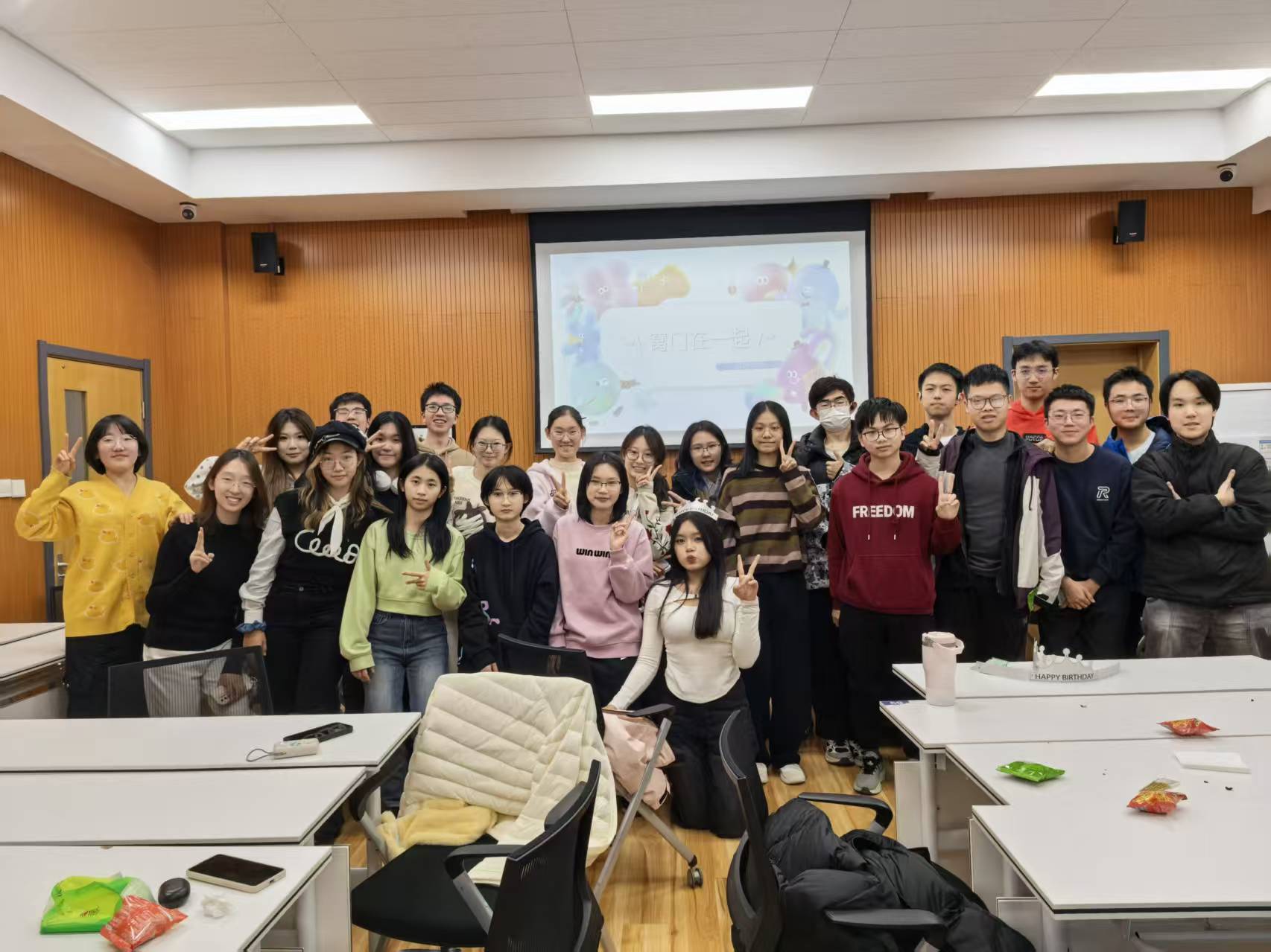 2025年12月9日晚18:00,98色花堂 2025级综合&励耘班为生日在9-12月的小寿星们举办了生日会。活动由生活委员缪蕴美、柴一诺策划并主持,两班同学均有到场,班主任齐老师惊喜参会。 活动伊始,二位主持人为前来祝寿的同学们分发了印有零散故事片段的小纸条作为分组的依据,能够拼出一则完整故事的字条被分到同一个小组。有趣的小故事让现场充满了快活的空气。 接着,大屏上依次呈现出各位小寿星们的个性特征,随着“星动嘉宾”的神秘身份被一一揭晓,各个小组也迎来了它们的小组长。轻松的互动环节增进了同学们的彼此了解,同时让生日会的氛围更加愉快。 热场环节过后,便是万众期待的分蛋糕环节!全场熄灯,烛光曳曳,《生日歌》的旋律轻轻响起;一齐拍手,一同唱歌,友谊的涟漪悠悠泛起。小寿星许下心愿,种下祝福;同学们目光炯炯,暖意浓浓。综合励耘在此时此刻变成了一个拥抱着所有人的大家庭。