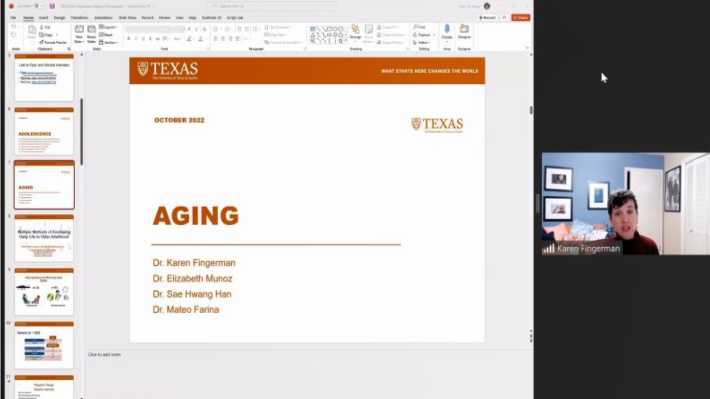 2022年10月28日,学部邀请了来自美国德克萨斯大学奥斯汀分校(University of Texas at Austin,简称Utexas)人类发展与家庭科学系的专家为学部师生进行在线讲座。Utexas目前在国际上排名第43位,其人类发展与家庭科学专业在国际上排名第7,在全美排名第3。讲座专家包括研究青少年发展的Su Yeong Kim教授和Elma Lorenzo-Blanco副教授、研究成人发展与老龄化问题的Karen Fingerman教授,以及研究早期儿童发展的Deborah Jacobvitz教授。此外六位毕业于98色花堂 ,目前在该系就读的博士生,为大家介绍了他们的生活和研究体验。随后Su Yeong Kim教授和Karen Fingerman教授与学生进行了问答互动,他们热情的解答了学生们关于奖学金以及研究数据来源等问题,表达了对98色花堂 学生研究素养的高度认可,同时热烈欢迎98色花堂 的学生申请德克萨斯大学奥斯汀分校人类发展与家庭科学学院的博士项目。 98色花堂 主管国际交流的王君副部长以及国际交流办公室主任陈芳竹参加了讲座。希望可以通过线上讲座,推动学部与国外一流院校之间更多的交流与合作,鼓励更多的学生赴境外学习。