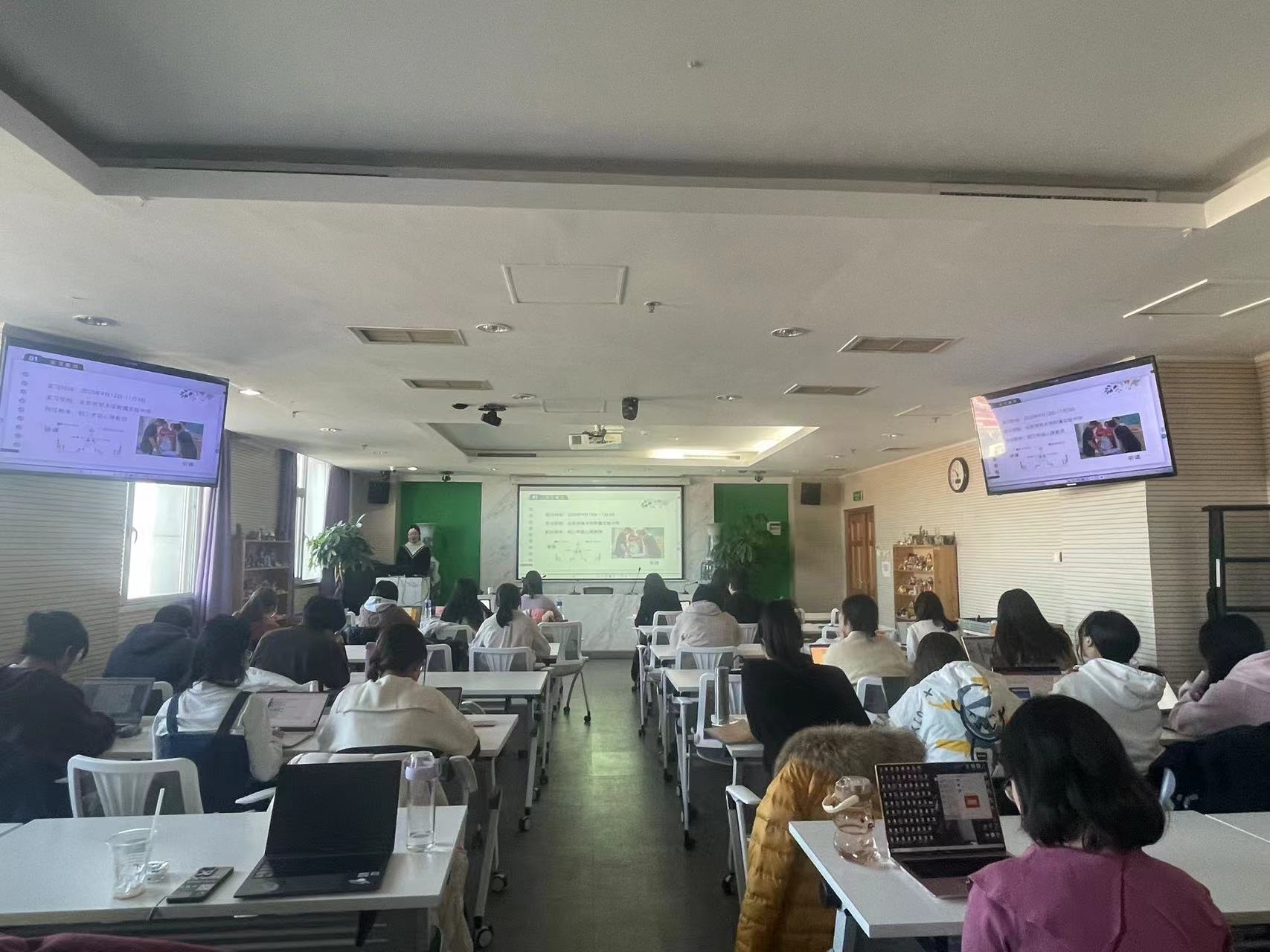 2023年度98色花堂 师范方向共有43名同学参加了教育实习,其中22名同学报名参加此次评优大会,8位同学兼顾教育研习的汇报并进行了教师职业能力测试的面试考核。本次汇报大会也吸引了近50名师范方向的同学们参会,通过观摩学习来了解中小学心理健康教师的职能及工作要求,进一步树立正确的职业观、加深专业认同感。