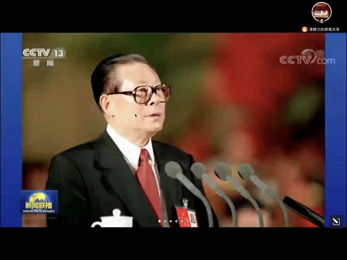 首先,会议第一项,全体成员起立,奏唱国际歌。 随后,支部书记谭静文同志播放视频,带领同志们一同观看“江泽民伟大光辉的一生”。跟随着视频,全体同志怀着悲痛的心情,一同悼念江泽民同志,学习江泽民同志的优秀品格与伟大功绩。