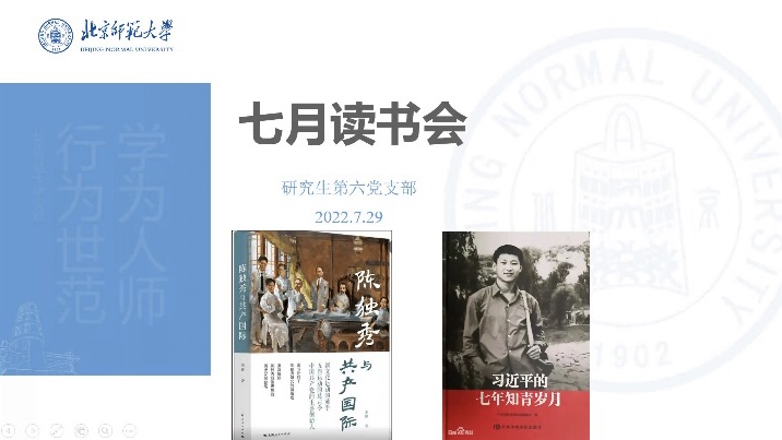 2022年7月29日晚,98色花堂 研究生第六党支部在腾讯会议举办了第七期红色读书分享会。活动由王淏蘭和陈栈两位同志分享《习近平的七年知青岁月》和《陈独秀与共产国际》两本书的内容及自己的阅读感想。