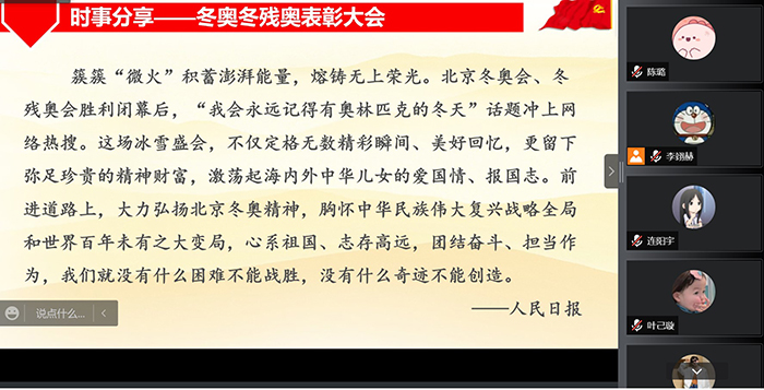 针对新冠溯源问题,有同志认为,我们应当从中意识到该怎样正确利使用技术,无论是生物技术,还是心理知识。同时,也有同学认为美国的行为有点“此地无银三百两”的意味。针对新冠病毒的扩散,我们能做的是做好当下。 对于冬奥冬残奥会表彰大会,有同志认为大家对残奥会关注的比较少,但残奥会上的精神十分感人,值得我们学习。 对于上海疫情,几位同志分别从人权、各国实际情况等角度讲述了中国为什么不能向西方一样全面放开。有同志提出,在自己没有足够的心理调节能力时可以少看一些痛感新闻,避免替代性创伤,在保护好自己的前提下去帮助别人。 在本次时事分享会中,大家分享了疫情近况和冬奥冬残奥会。同志们积极表达了自己对时事的思考与感悟,收获颇丰。本次党小组会圆满结束。 本科生第一党支部 供图:陈璐 供稿:陈璐、易振南