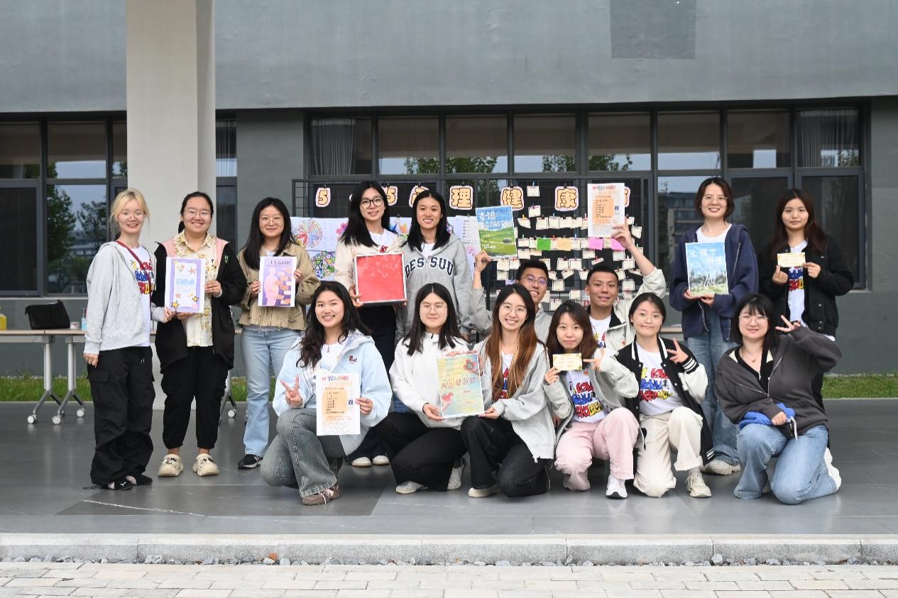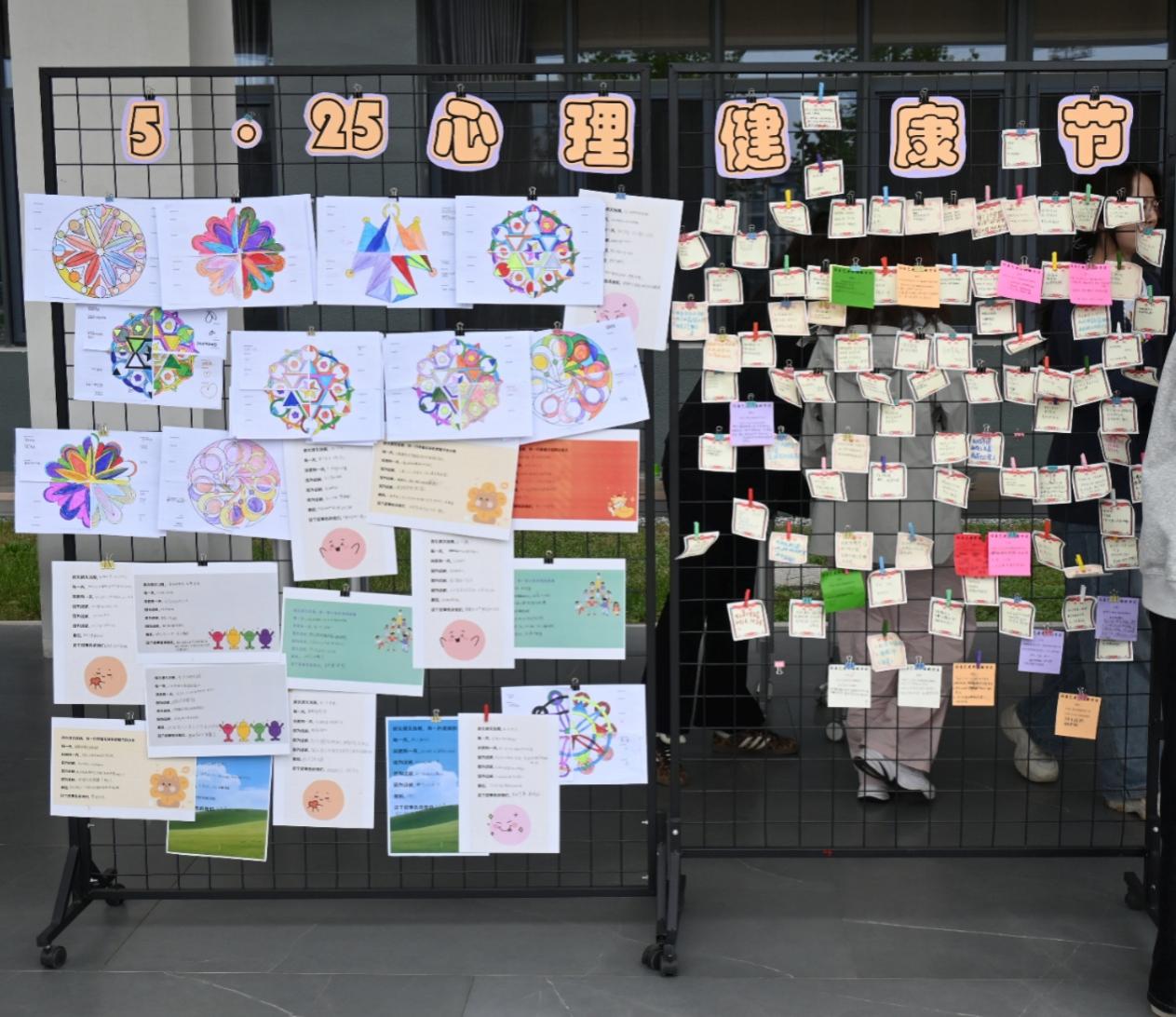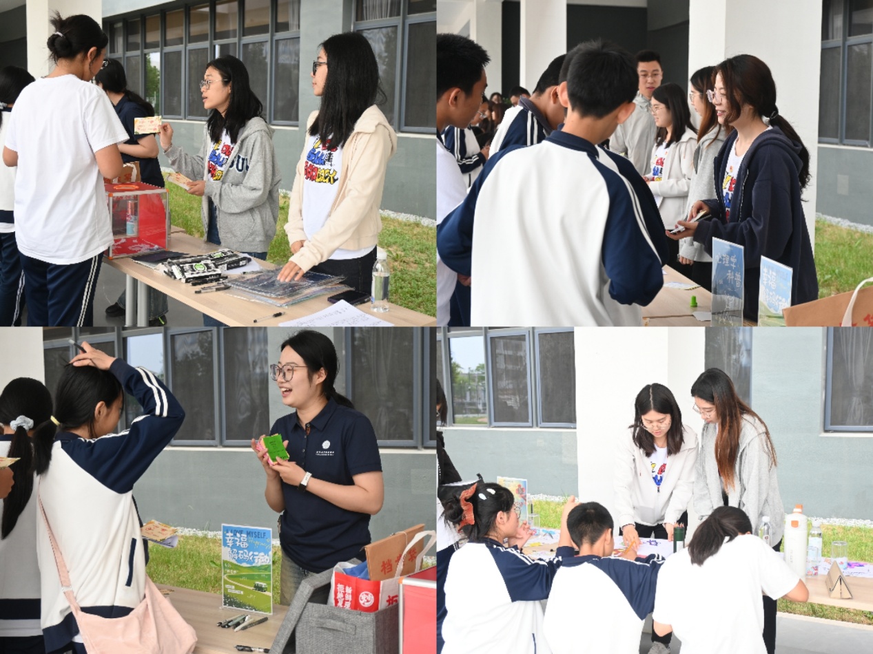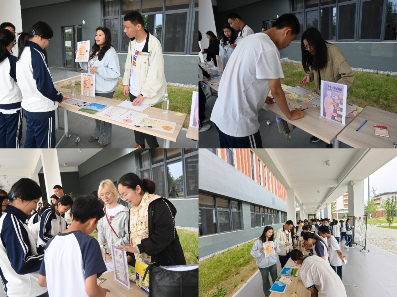 12时,活动正式开始。师生们各司其职,“八句话”摊位向学生传达“yes,and”的理念,鼓励接纳生活中已经发生的事情,并勇于写下自己之后的故事;“二十个我是谁”摊位让学生深度探索自我,通过他人视角补充自我理解,促进多元自我认同;“闪光点收集站”摊位通过正向反馈强化自我价值感,打破自我否定惯性,构建积极心理暗示,提升群体归属感与自信心。“情绪曼陀罗”摊位鼓励学生通过艺术创作探索内心的力量和成长,也促进团队的信任与协作;“心理学科普摊位”向学生传达包括学习、人际等方面的心理学知识,助力学生日常学习生活;“幸福解码行动”摊位鼓励学生们完成“让自己更幸福”的一件小事……