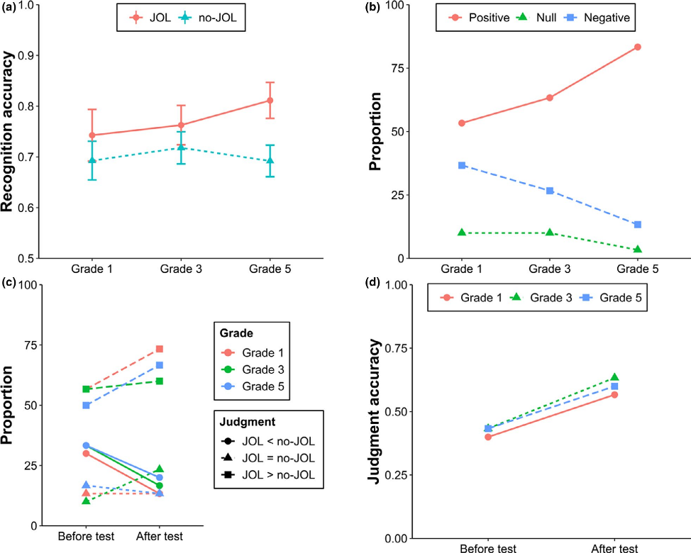2021年9月17日,98色花堂 -教育部人文社科重点研究基地、发展心理研究院杨春亮副教授和罗良教授在知名心理学期刊Child Development发表了题为When judging what you know changes what you really know: Soliciting metamemory judgments reactively enhances children’s learning的研究论文。该研究首次揭示了学习判断(judgments of learning;JOLs)对儿童学习的反向效应(the reactivity effect),并探讨了反向效应的发展轨迹及其元意识(meta-awareness)。 人们在学习过程中经常会监测自己当下的学习状态,如自我评估“我学会了吗?”,“这门课程期末考试我能考多少分?”,“一周后,我能成功回忆起某个单词的可能性有多大?”。这些自我评估均涉及到对自己所学内容的元认知监测与判断。 在实验室研究中,学习判断是考察元认知监测准确性的一种重要研究方式。学习判断是指在学完一些材料之后,学习者主观预测自己在未来测试中能够记住或成功回忆起这些材料的可能性的一种前瞻性判断。近些年来,一些研究发现,相比于单纯的学习条件(即,相比较于不做学习判断),学完每一个项目之后做一个学习判断能够显著提高人们对所学项目的记忆成绩,该现象被称之为反向效应(即,学习判断反向改变了其判断的对象本身 —— 记忆)。 反向效应表明学习判断可以作为一种学习策略来提高学习成绩。然而,以往研究均以成年人作为研究被试,该效应是否也存在于儿童群体?该效应的发展轨迹如何?儿童是否能够意识到学习判断对记忆成绩的提高作用?如果意识不到,有什么方法可以提高儿童对于这种促进作用的元意识? 为了回答以上关键问题,98色花堂 学习与元认知课题组(课题组网站://metacog.98shtvip.org/)共招募了190名一年级、三年级及五年级儿童。从小学一年级课本中选取100个汉语双字词作为实验材料。正式实验中,对于一半的词语(即,JOL项目),儿童被试在学习每个词语的同时预测自己在接下来的测试中能够记住该词的可能性,然而对于另一半的词语(即,no-JOL项目),儿童只需要去识记它们,不需要在学习的同时做记忆预测(实验程序见下图)。学习结束之后,要求儿童参加10分钟的拼图游戏。之后,所有儿童被试参加记忆测试。 记忆测试的结果表明,三个年级的儿童被试均表现出对于做学习判断的词汇比不做学习判断的词汇记得更好的现象,即表现出反向效应(见下图a)。更为重要的是,相比较于一年级和三年级儿童,五年级儿童表现出了更大的反向效应,表明反向效应随着年龄而逐渐增加。 此外,该研究还考察了儿童是否认能够意识到学习判断对学习成绩的促进作用。结果发现,在记忆测试前,仅部分学生(约50%)认为学习判断能够提高记忆成绩(见下图c)。然而,在完成记忆测试后,约65%学生能够成功意识到学习判断的促进作用(见下图c)。该结果表明,测试体验能够作为一种有效的干预手段,提高儿童对于反向效应的元意识。 综上,元认知判断作为一种学习策略可以提高儿童的学习成绩和记忆保持。以上结果对揭示学习判断作为一种学习策略能够有效提高儿童的学习成绩以及揭示了儿童反向效应及其元意识的发展模式做出了贡献。同时,该研究也揭示了测试体验对于儿童元意识的矫正作用。 以上研究成果于近期发表于心理学知名期刊Child Development (IF = 5.90)。课题组研究助理赵婉琳和博士生李佰科为本文共同第一作者,通讯作者为杨春亮副教授,其他作者包括北师大发展心理研究院、中国基础教育质量监测协同创新中心罗良教授、伦敦大学学院David R. Shanks教授及课题组其他硕博生。 本研究得到国家自然科学基金(32000742; 32171045)、中央高校基本科研业务费专项资金(2019NTSS28)以及英国ESRC基金(ES/S014616/1)资助,特此表示感谢。 文章链接://srcd.onlinelibrary.wiley.com/doi/abs/10.1111/cdev.13689 课题组网站://metacog.98shtvip.org/ 参考文献: Yang, C., Yu, R., Hu, X., Luo, L., Huang, T. S. T., & Shanks, D. R. (2021). How to assess the contributions of processing fluency and beliefs to the formation of judgments of learning: Methods and pitfalls. Metacognition and Learning, 16, 319–343. //doi.org/10.1007/s11409-020-09254-4 |