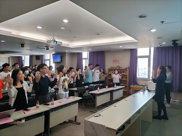 图8 王瑞敏老师带领同学们进行身体活动 学生工作办公室的李昕益老师对学校为学生提供的资助体系进行了详尽的介绍,包括国家奖学金、国家励志奖学金、助学金及助学贷款等;此外老师还介绍了学部勤工助学岗位的情况,提醒同学们及时关注、及时申请。