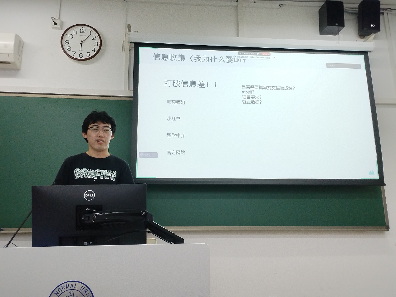 2024年5月25日晚18:00,学业辅导室在教二103开展了出国经验分享会。本次活动采取线上线下结合的方式,由张馨悦同学主持,邀请了几位拥有出国留学申请经验的同学作为嘉宾进行分享,他们分别是去往新加坡国立大学的马啸天师兄、去往新加坡国立大学的车俐颖师姐、去往加州大学圣地亚哥分校的卢以恒师兄。 马啸天师兄的分享主题是无中介DIY跨申。马啸天师兄拿到了英国的帝国理工学院、新加坡的新加坡国立大学和香港的香港大学的offer,拥有丰富的跨国申请经验。师兄介绍到想要出国留学需要打破信息差,可以通过留学中介、师兄师姐、社交媒体、官方网站等渠道提前收集信息,了解目标学校的语言成绩要求、项目要求等。另外师兄提醒到要在简历中阐述清楚个人实习、科研和社会责任,在个人陈述中讲好自己的故事。
