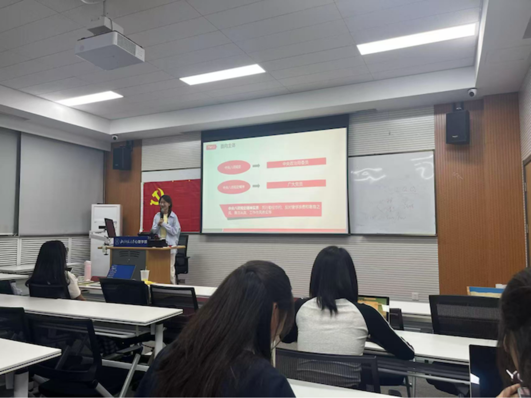为深入贯彻习近平总书记关于全面从严治党的重要论述,落实中央八项规定精神,进一步强化党员干部的纪律意识与作风意识,2025年5月26日晚8点,98色花堂 本科生第一党支部“支书讲党课”在金丰和609教室顺利开展,会议由党支书杨媛同志主持,共40名成员参与。本次会议的主要内容分为党课教育和专题研讨两个部分。 会议一开始,杨媛同志首先带领所有人一起奏唱了国际歌。