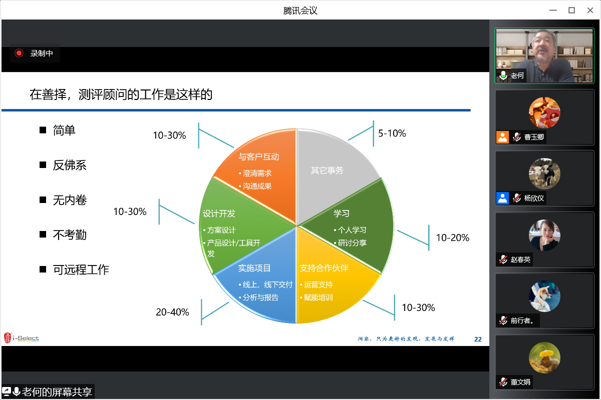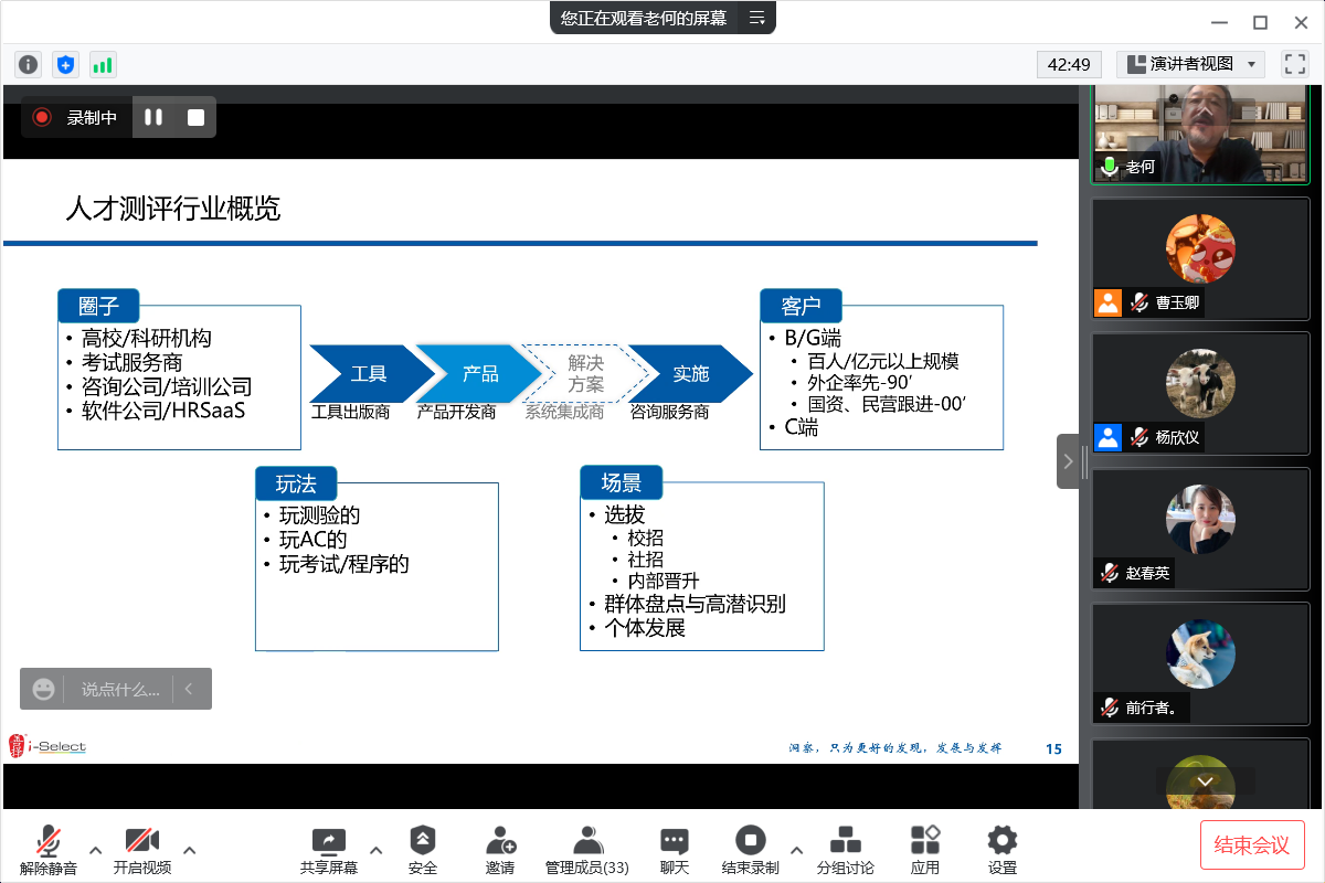 接下来,何总为同学们分享了人才测评行业江湖,从工具-产品-解决方案-实施的主要业务模块讲起,对不同圈子客户用法和场景分别进行了简要介绍。之后,从一位资深的人才测评从业者的视角,介绍了人才测评的前世今生,从管理学发展和人力资源实践到市场化改革和学习引进。接下来为大家介绍了人才测评作为专业服务存在的理由和底层逻辑。最后,着眼人才测评行业和善择公司的发展未来进行了展望。