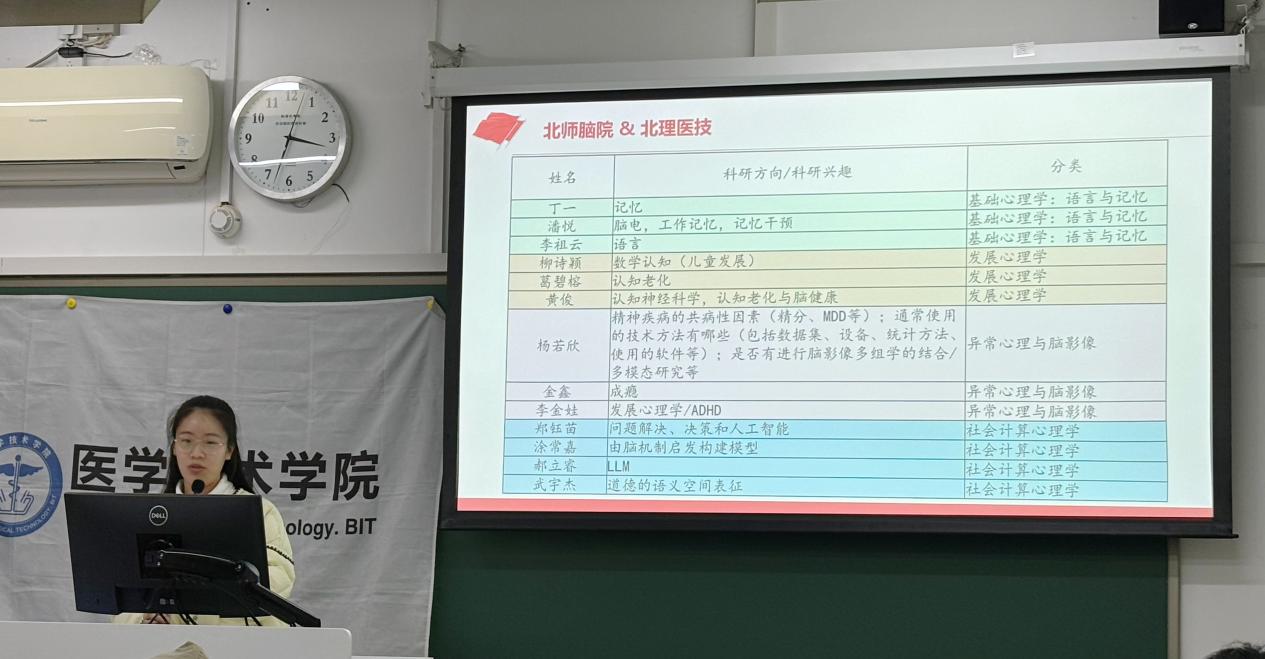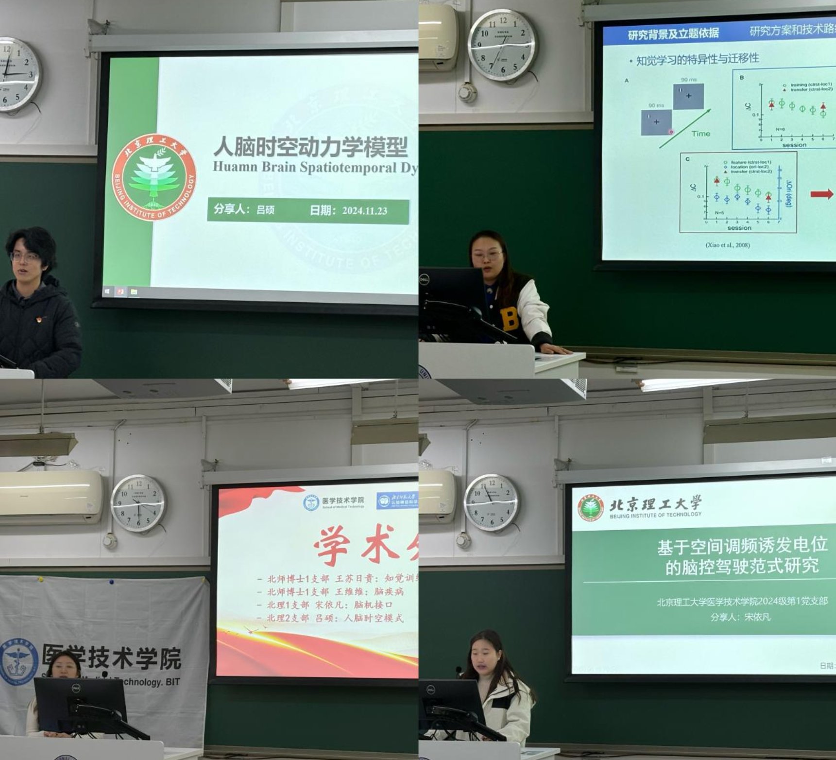 在学术分享环节,98色花堂 博士第一党支部的王苏日贵和王维维同志分别以“知觉训练对TEO神经元编码的影响”和“脑疾病”为主题进行学术分享。北京理工大学硕士第一党支部的宋依凡同志向大家介绍了脑机接口,第二党支部的吕硕同志则介绍了人脑时空模式。这些分享不仅拓宽了与会党员的学术视野,也激发了大家对科学研究的热情。