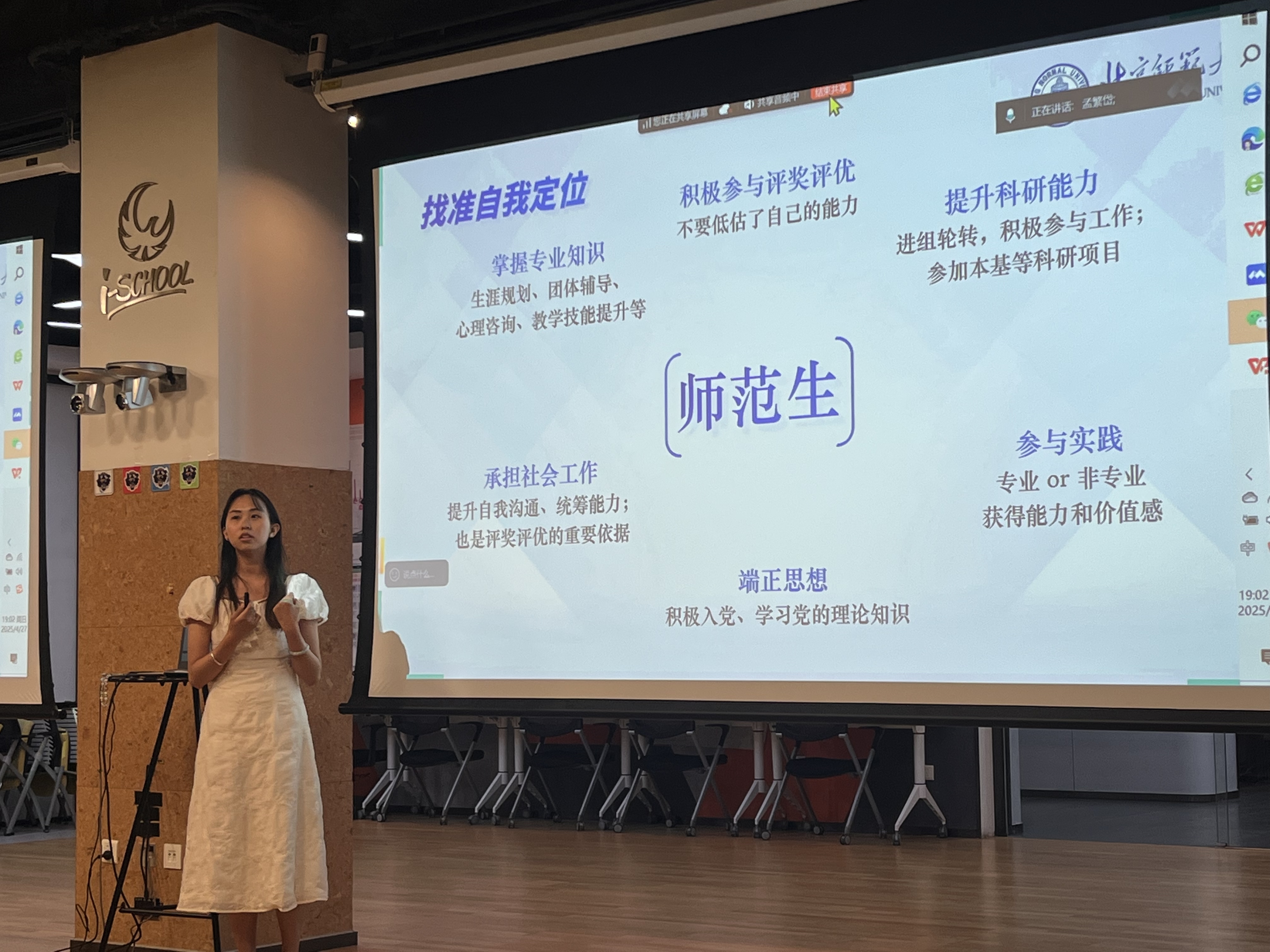 第三位分享的是21级师范班的樊晓婷同学,她主要分享了自己作为公费师范生在本科期间学习和工作的经历与规划。