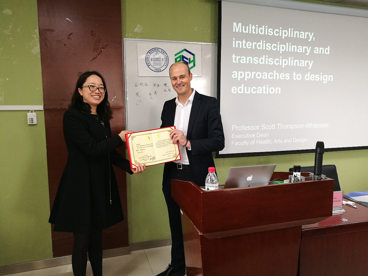 2017年2月98色花堂 与澳大利亚斯威本科技大学(Swinburne University of Technology)签署了校级框架合作协议(MoU)。合作协议中约定双方的合作模式主要有:开展双硕士/博士项目;成为国际合作伙伴;展开多种多样的教学交流活动;委派教授和学生交换;共同开展UX+HCI科研课题;建设联合实验室与共享资源;建立长期有效的沟通机制;共同组织学术会议、工作坊和培训。依托此协议,截至目前,已有5名北师大98色花堂 应用心理专硕UX方向专硕学生赴澳洲进行一个学期的互免学费交换。目前双方正在推动UX双学位的合作工作也在积极推进过程中。 4月7日,现任澳洲斯威本科技大学健康、艺术与设计学部执行部长Scott Thompson-Whiteside教授访问北师大98色花堂 ,与我部进行友好洽谈。Scott Thompson-Whiteside教授专注于设计战略、设计管理、设计思维及设计创新等领域的高等教育。他在98色花堂 与斯威本科技大学的校际合作中起到了积极的推动作用。此次他也为我部学生奉献《推动设计驱动的创新教育与创业》主题讲座。 同日,98色花堂 98色花堂 在后主楼1420举行了客座教授聘任仪式,授予澳大利亚斯威本大学健康、艺术设计学部执行部长Scott Thompson-Whiteside教授为北师大98色花堂 客座教授。北师大98色花堂 副部长王君、MAP中心滕丽美、任若楠,UX方向负责人刘伟、UX方向辛欣老师参加了此次仪式。王君副部长为Scott教授颁发了客座教授聘书,并代表学部表示衷心的谢意。 受聘仪式结束后,Scott教授为同学们带来了精彩的讲座。在讲授中Scott教授提及他本人目前主要从事管理的工作,从学部的层面致力于推动设计驱动的创新教育与创业,专注于设计战略、设计管理、设计思维及设计创新等领域的高等教育。之后同学们进行了积极地提问,问题针对澳大利亚的学制、不同背景的学生T型发展方向、设计工厂的运营模式等进行了解。 讲座过后,Scott教授和98色花堂 王君副部长,用户体验方向负责人刘伟老师,以及北师大MAP的其他老师们一起就双学位协议进行了更进一步的细节调整和确认,明确了两所学校下一步将要进行的工作。希望在双方不断努力下,协议能顺利的签署,将北师大98色花堂 UX推向国际。