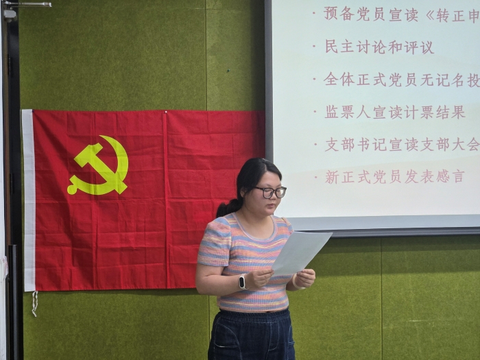 接着,杨雨凡同志宣读了自己的转正申请书,向党组织汇报了近一年来的思想、学习、工作等表现情况。在支部书记的组织下,与会同志对杨雨凡同志的情况进行民主讨论和评议,肯定了杨雨凡同志在支部内担任组织委员的兢兢业业与一丝不苟。支部大会全体正式党员同志进行无记名投票表决,同意杨雨凡同志按期转正。杨雨凡同志发表了转正感言,表示将时刻以党员标准审视自己,把党的宗旨牢记心间,用行动诠释党员的忠诚与坚韧,保持对党的敬畏之心,持续学习党的理论,为党的事业不懈奋斗。