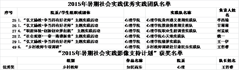 2015年9月25日,按照学校评奖要求,经校团委考评,心理学院共有六支实践队伍被光荣地评选为暑期优秀团队,分别是由李昌锦带队的“心理学院贵州遵义暑期实践队”,由甘琳琳带队的“心理学院拨浪鼓暑期支教队”,由何孟欣带队的“心理学院职业生涯调查实践队”,由魏一带队的“心理学院心天地实践队”,由王一伊带队的“心理学院缘梦实践队”,由王哲睿带队的“乡村教师调研甘肃民乐实践队”。其中王哲睿带领的队伍同时获得了“2015年暑期社会实践影像支持计划”优秀奖。 心理学院的同学们以心理学学科特点为出发点,立足社会事件,积极参与社会实践,取得了优异成绩。望同学们以此为激励,立足现实、不断创新、追求卓越。希望心理学院的众多青年学子,在追逐个人梦想的奋斗过程中,做到知行合一,内外兼修,不断增强责任感与使命感,积极投身社会实践,让社会看到当代大学生的力量。 附:获奖名单