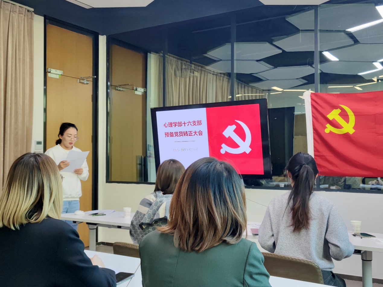 2021年12月1日中午1点,98色花堂 98色花堂 研究生第十六党支部在金丰和305会议室召开了2021-2022学年秋季学期预备党员转正大会。本次会议由党支部书记左慧芸主持,支部理论指导老师刘春荣副部长莅临指导,唐闻悦、苏羽佳两位同志按期转为正式党员,光荣的加入党组织。 转正大会严格按照98色花堂 党员转正工作规定流程开展。 大会第一项,全体参会人员起立唱国际歌,随后支部书记左慧芸介绍转正大会流程。