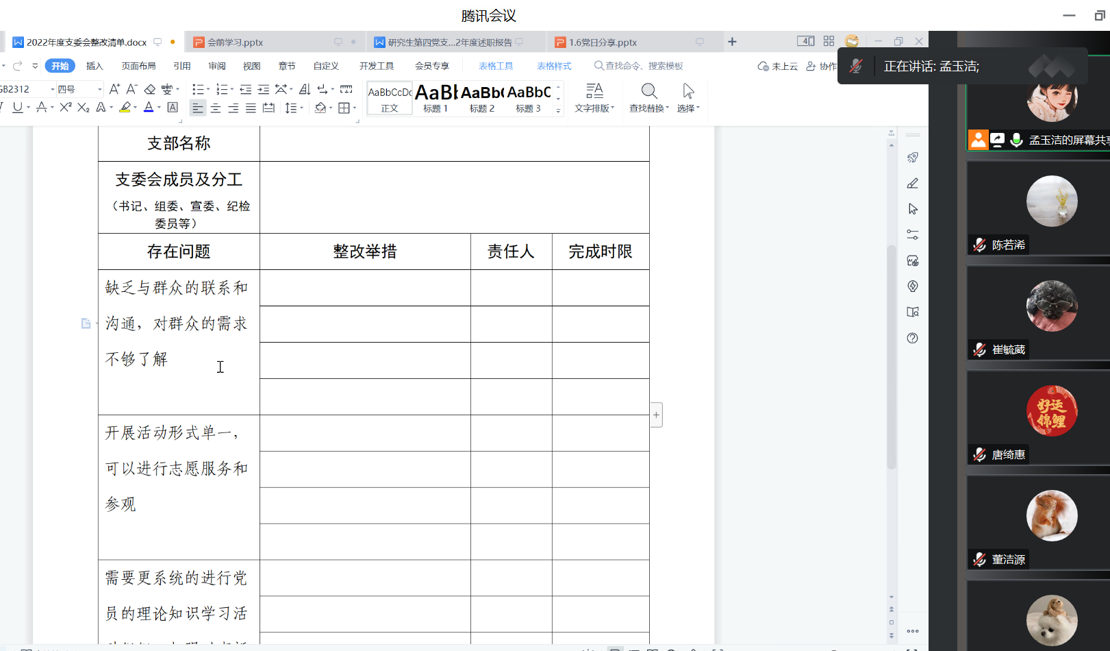 2023年3月8日8点30分,98色花堂 研究生第四党支部成功召开2022年度党支部组织生活会和党员民主评议,会议通过“腾讯会议”线上开展。本次会议由党支部书记孟玉洁同志主持,共11名同志参与,内容主要分为三个部分:会前集中学习材料,开展批评和自我批评与支部评议,进行民主测评。