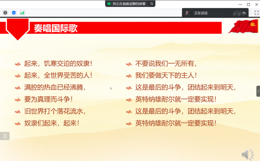 首先,梁静同志带领全体同志奏唱《国际歌》。 接下来,求索学社宣讲团成员张一帆同学开始宣讲。关于“第一个答案”,张一帆同学播放了一个视频。在视频中,毛泽东同志回答了如何跳出历史周期率,指出跳出的方法就是坚持民主,走群众路线,强调人民监督政府的重要性。
