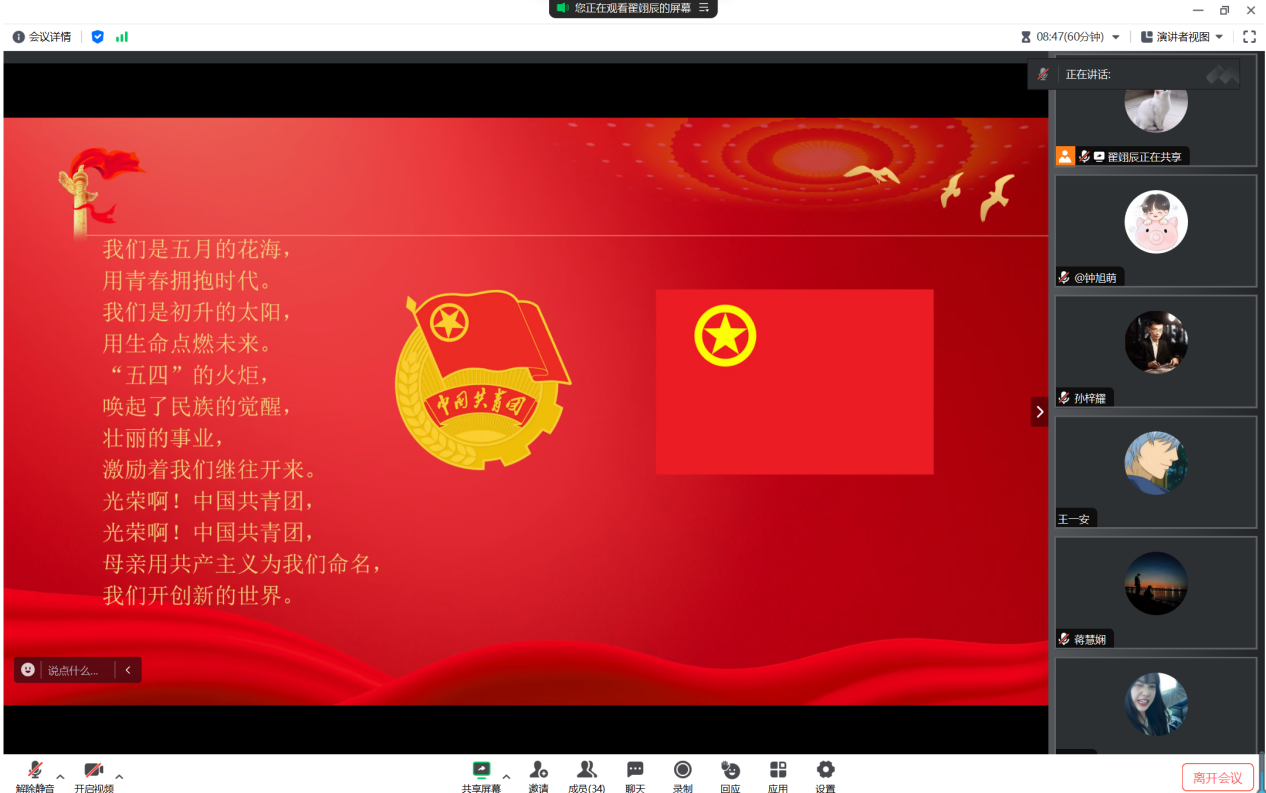 会议伊始,我们将共同奏唱团歌,用激昂的旋律激发团员们的爱国热情。紧接着,在过去的一学期中,我们团支部携手共进,团结奋发,共同完成了多次团日活动和专题学习教育,围绕“思想旗帜”、“坚强核心”、“强国复兴”以及“挺身担当”四个主题,在这一过程中,通过不断的学习,反思总结和改进,同学们对如何成为一名合格的共青团员、如何更高标准的要求自己、如何切实发挥好团员的青年先锋作用有了更加深刻的领悟。在这一过程中,同学们进一步了解了共产主义精神和思想,牢牢把握住团员自身的思想旗帜;培养自身党性,坚定共产主义信仰,逐渐有了坚强核心;进一步解放思想,了解中国式现代化的重要性和必然性,了解了中国式现代化的内涵,认识了其成因,熟悉了其推进方式,对民族复兴、强国建设有了一份自己的北师大学子的答卷,强国复兴,我们在行动;最后,在对先辈榜样故事的学习中,团员们更加深切理解团员的身份责任,努力发挥先锋作用,向榜样学习,对过去总结改进,挺膺担当时代重任。