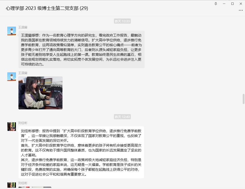 经过本次线上学习讨论,支部党员进一步加深了对两会精神内涵的理解。大家一致认为,此次学习使他们对国家发展形势和政策要点有了更全面的把握,进一步明确了自身努力的方向和责任。与会党员纷纷表示,要将学习两会精神的收获转化为前进动力,在今后的学习和科研工作中知行合一、担当作为,以实际行动贯彻落实两会精神。下一步,党支部将以本次学习讨论为契机,创新学习形式,常态化开展两会精神学习活动,确保两会精神在支部落地见效。此次学习讨论会进一步统一了思想、凝聚了共识。党员们表示将以更加饱满的精神投入今后的工作和学习,为学校发展和中华民族伟大复兴贡献青春力量。 2023级博士生第二党支部 供稿人:桂阳 供图人:桂阳 审核人:齐乐融融