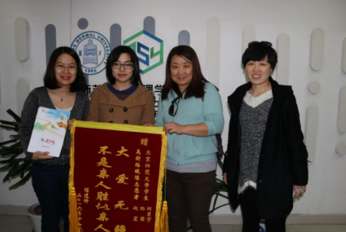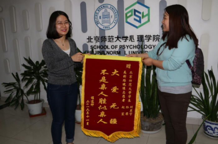 2017年3月14日,我部2012级本科生孙鑫,2013级本科生刘星宇,赵宸三位同学因其在美新路公益基金会的志愿服务获赠锦旗,分团委书记史佳鑫老师代表学部接受锦旗 。 图1-史佳鑫老师接受锦旗