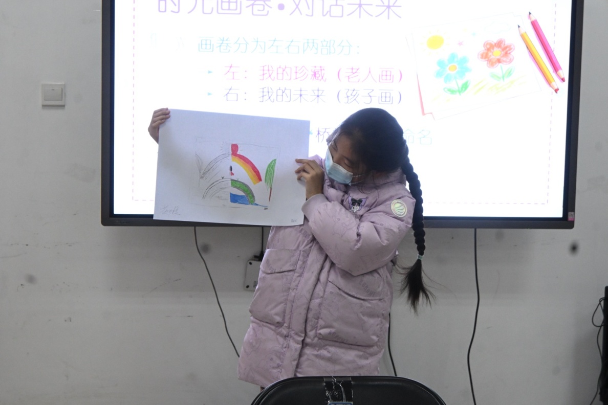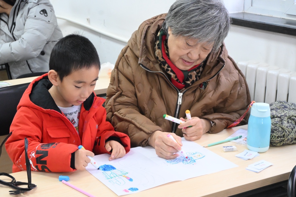 本次活动的核心环节——“时光画卷·对话未来”将现场氛围推向高潮。一老一幼结成搭档,共同执笔创作。老年朋友用沉稳怀旧的色调,在画纸一侧描绘承载着个人记忆的“旧物”,如一台老式收音机、一枚珍贵的奖章;孩子们则用明快鲜亮的色彩,在另一侧勾勒出代表“未来想象”的航天器、智能机器人等,讲述画作背后的故事。这一环节在共同创作与故事分享中,搭建了心灵沟通的桥梁,实现了生命经验的温暖传递。
