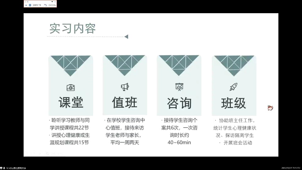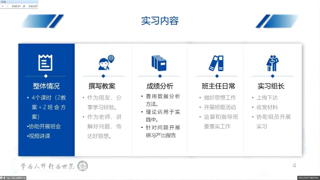 2022年12月31日上午,98色花堂 教育实习总结汇报大会顺利举办。本次活动由负责本科师范班见习实习的陈师韬老师主持,同时邀请了本科师范班团队负责人刘霞老师、骨干刘艳老师以及本次教育实习指导老师之一王孟元老师为同学们提供反馈和指导。在本次参与教育实习的35位同学中,共有18位同学通过汇报展示的方式进行了教师职业能力测试面试及各类评优展示。本次汇报大会也吸引了近70名大一至大三同学线上参会,以学习了解中学心理健康教师教育实习情况。 汇报正式开始前,主持人陈师韬老师介绍了本次总结汇报大会的目的、具体要求及各位参会老师。随后,18位同学按照预先分成的三人一组,按顺序进行了五分钟的汇报,随后由参会老师进行点评交流。本次汇报主要涵盖了同学们各自的实习概况、实习内容和主要收获三部分。由于今年不同地区的疫情形势不同,同学们遵循各地及学校的防疫政策分别进行了线上、线下或线上线下相结合的教育实习。实习方式的不同为同学们带来了形式多样的实习内容。但无论形式如何,同学们都在带队老师及实习基地指导老师的引导和帮助下积极完成了实习工作,并获得了丰富的收获。汇报过程中,参会老师积极与同学们进行互动,根据汇报内容提出相关问题,并进行整体的点评和反馈。 通过本次总结汇报大会,同学们对自己的教育实习工作进行了深入总结与反思,在教育实习实践基础上得到进一步学习与提升。同时,通过观摩学习大四年级的教育实习总结与反思,大一至大三各年级同学对教育实习工作也有了进一步认识和了解,不仅激发了同学们对心理学专业知识学习的动机,也增强了对中小学心理健康教师职业的认同。本次教育实习总结汇报大会取得圆满成功!