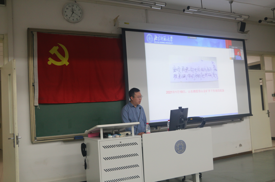 、协同中心、环境学院、天文系等四百余名师生党员和入党积极分子参加了本次讲座。 2021年1月10日,山东栖霞市西城镇五彩龙金矿发生爆炸。爆炸发生9天后,井下被困矿工通过3号救生孔传递上来一张新的纸条:“麻烦再送一部电话,作为备用,联系不到你们,我们就找不到党了”。历经14天的努力,井下幸存的11名矿工终于获救,“这句朴实的话说出了危难时刻,党在人民群众心中的分量。” 刘老师从“矿井下的小纸条故事”引入,启发同学们感悟中国共产党以“人民至上、生命至上”的现实担当,全心全意守护人民群众的生命财产安全,创造出一个又一个新的奇迹。