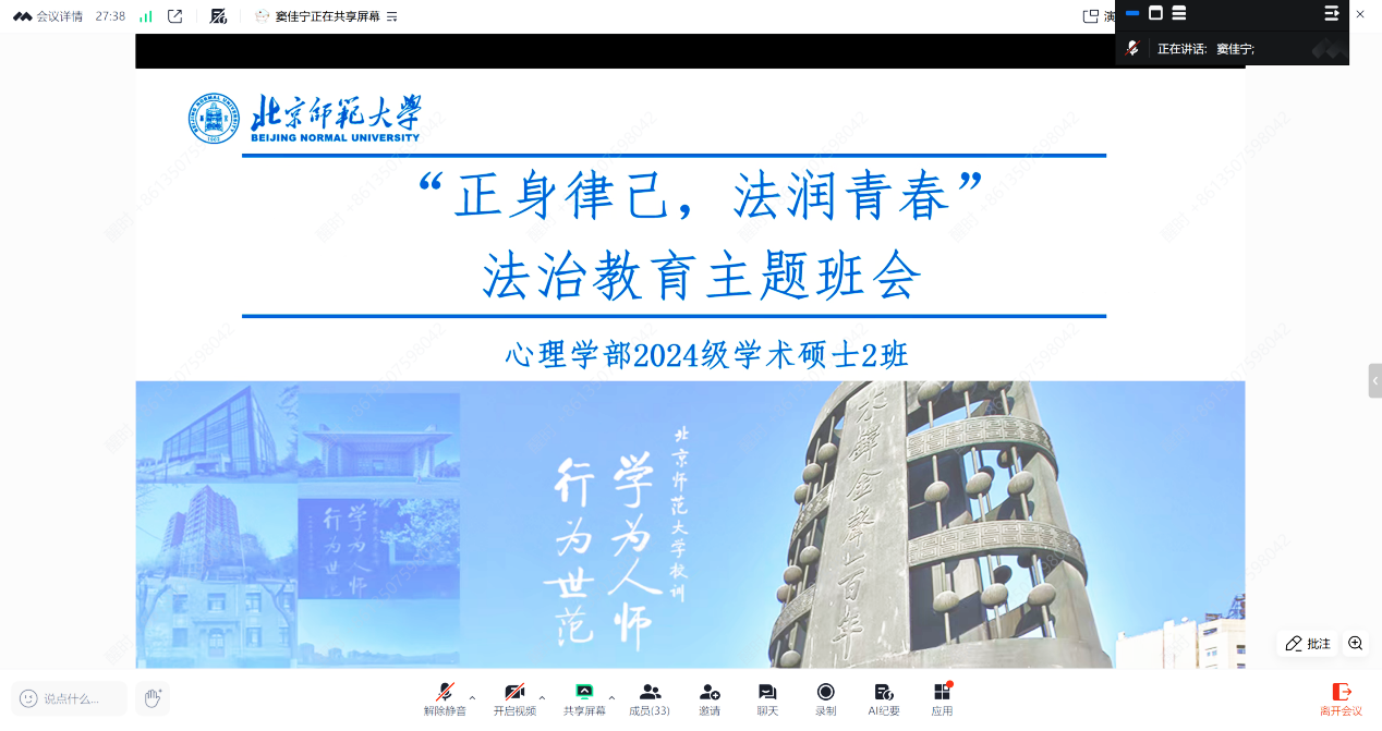 然后是学硕2班主题班会。班长窦佳宁同志以“正身律己,法润青春”为题,开展了法治教育的主题班会。其中,特别强调了与我们学生密切相关的案例,包括网络购物等。