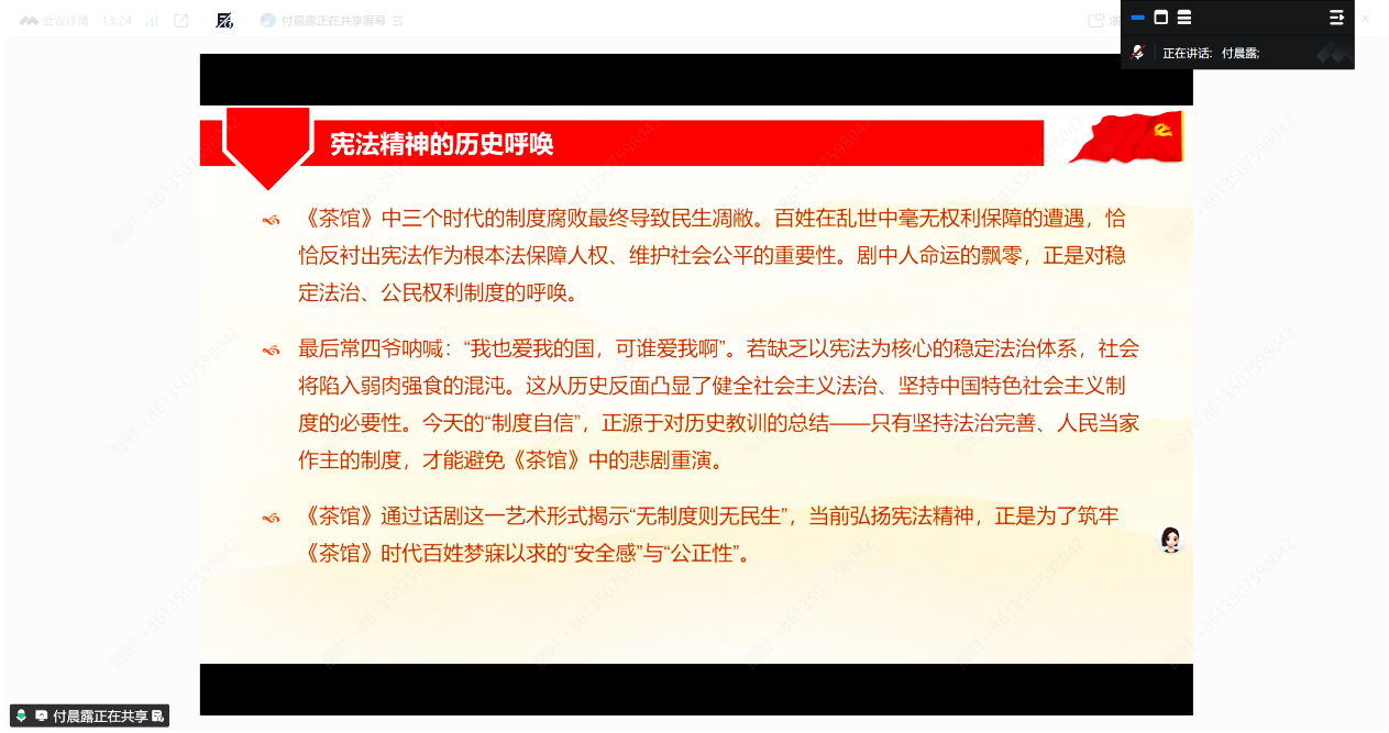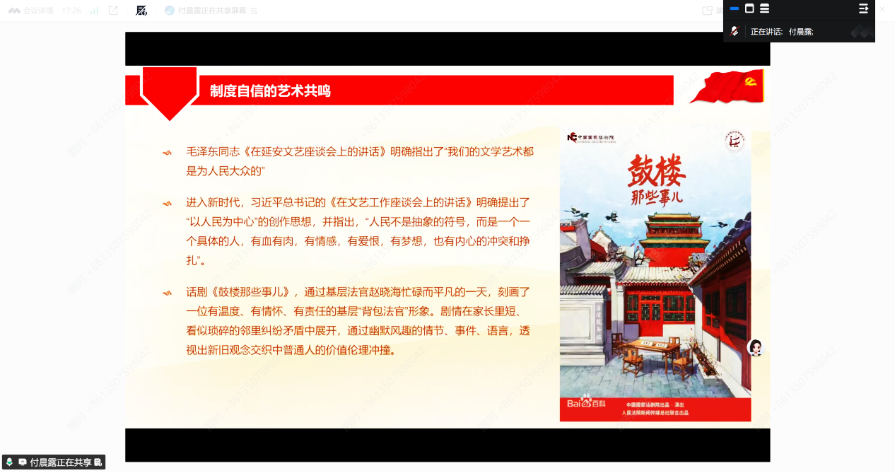 第二部分,讲解了制度自信的艺术共鸣。既延续着《在延安文艺座谈会上的讲话》“文艺为人民”的精神内核,呼应着新时代“以人民为中心”的创作思想,更在话剧《鼓楼那些事儿》对基层“背包法官”的鲜活刻画里,以百姓身边事让制度温度与群众情感同频共振。