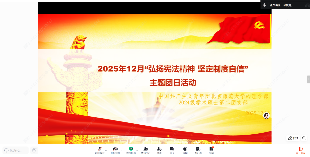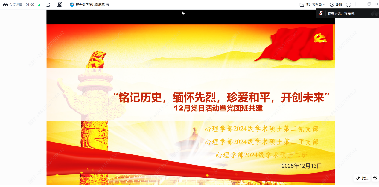2025年12月13日18时,98色花堂 2024级学术硕士第二党支部于线上平台顺利开展本月主题党日活动、2024级学术硕士第二团支部团日活动和学硕2班主题班会。本次会议由党支部书记程先楷同志主持。支部正式党员、预备党员和多位积极分子到场参会,班级其他团员同学到场学习。
