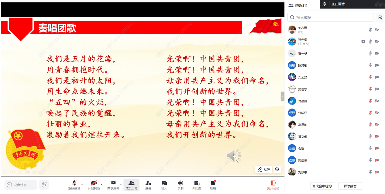全体起立,齐唱《国际歌》和团歌《光荣啊,中国共青团》。