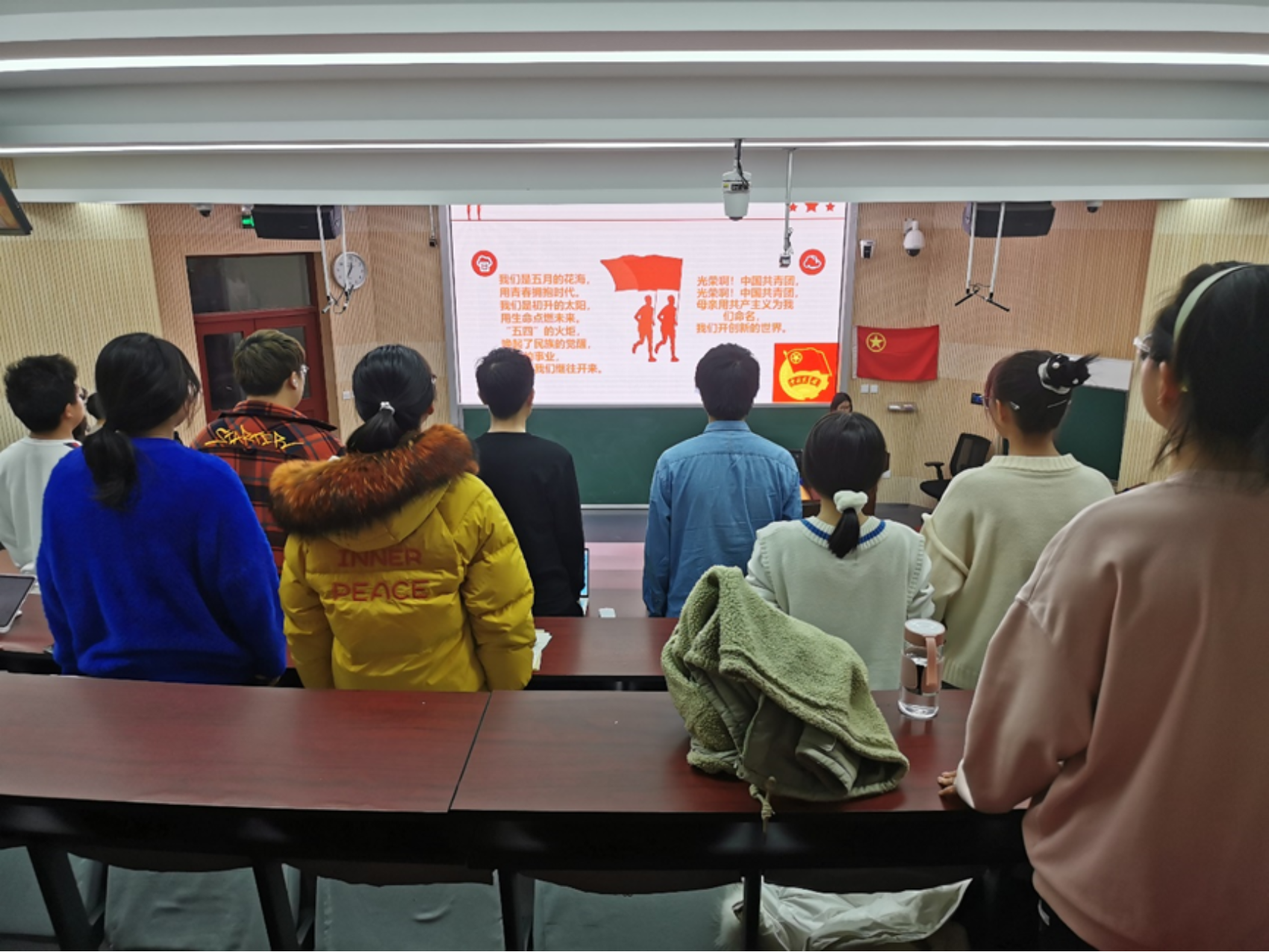 12月9日晚上7点到8点,初级团校举办的军旅生涯分享团课在电子阶梯教室成功举行。本次团课旨在用朴实而富有个性的生涯分享,激励学员们响应国家号召,并在他们当中宣传征兵政策。团课有幸邀请到了征兵宣讲团的两位宣讲人——张伟鑫师兄与张颖师姐,为大家进行军旅生涯分享。 团课开始前,主持人播放行军的暖场视频,并展示签到二维码让同学们进行签到。之后,全体起立,共唱共产主义青年团团歌。