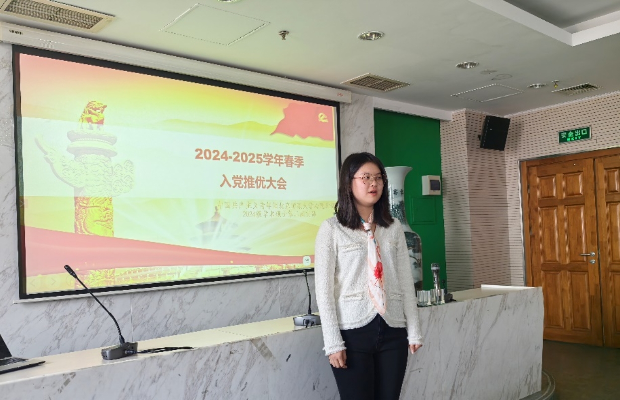 会议第一项,全体参会同学奏唱团歌。 奏唱团歌后,两名团员入党申请人——李佩玲、刘骐维依次陈述思想、学习、工作和生活等各方面的情况,对入党动机问题进行了详细地阐述。并且客观、公正、明确地指出自己的缺点与不足之处。